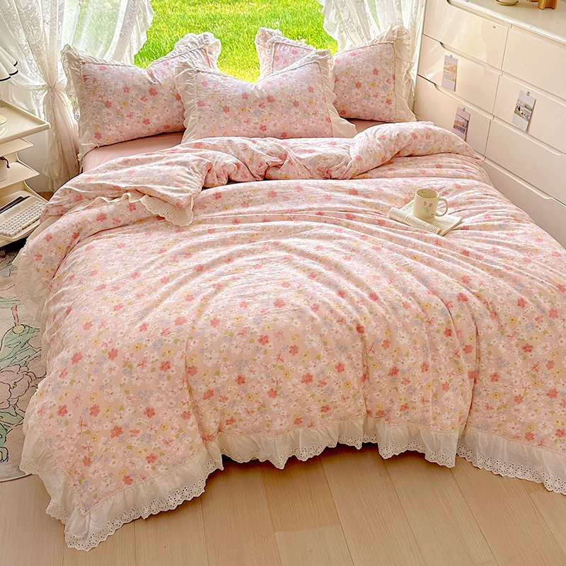 仟网汇 2025新款皱皱纱花边床裙四件套多功能夏被夏凉被空调被四件套四季通用 蔷薇恋人