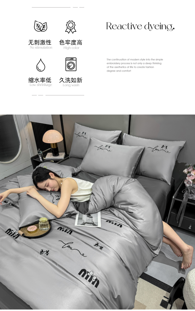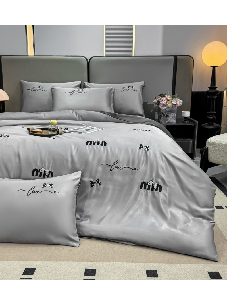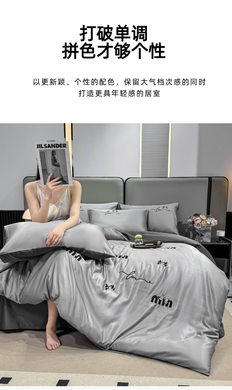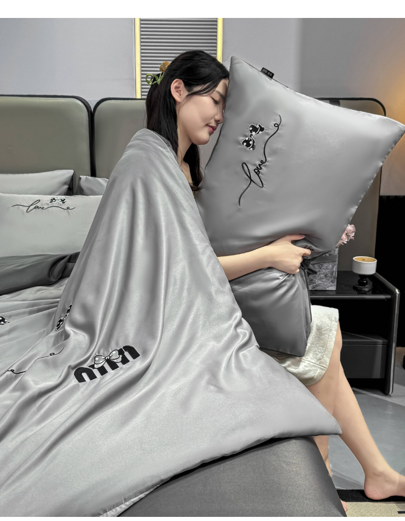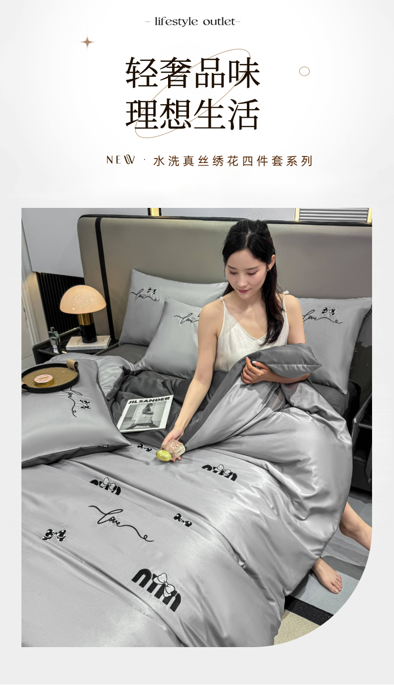 当前位置: 91家纺网 > 商品网购 > 床品套件 > 四件套 > 水洗真丝四件套 > 乐沐家纺 2025春夏新款水洗真丝绣花冰丝四件套 mm-烟云灰