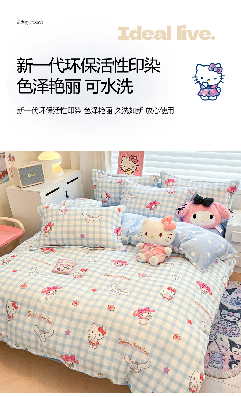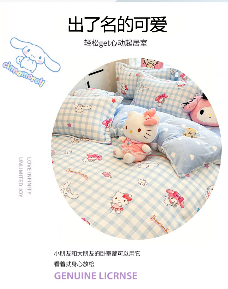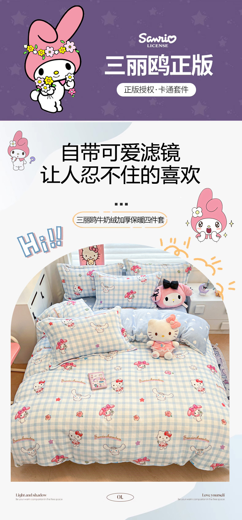 当前位置: 91家纺网 > 商品网购 > 床品套件 > 四件套 > 牛奶绒四件套 > 暮思家居 2025新款三丽鸥正版授权高克重200克加厚保暖卡通牛奶绒四件套 牛奶绒-三丽鸥大家族