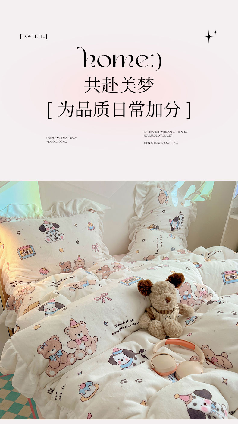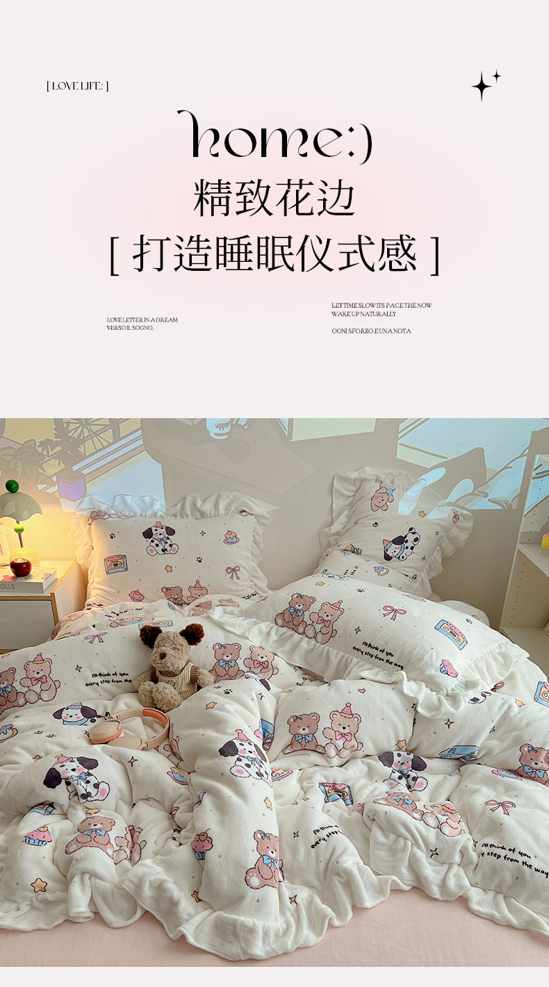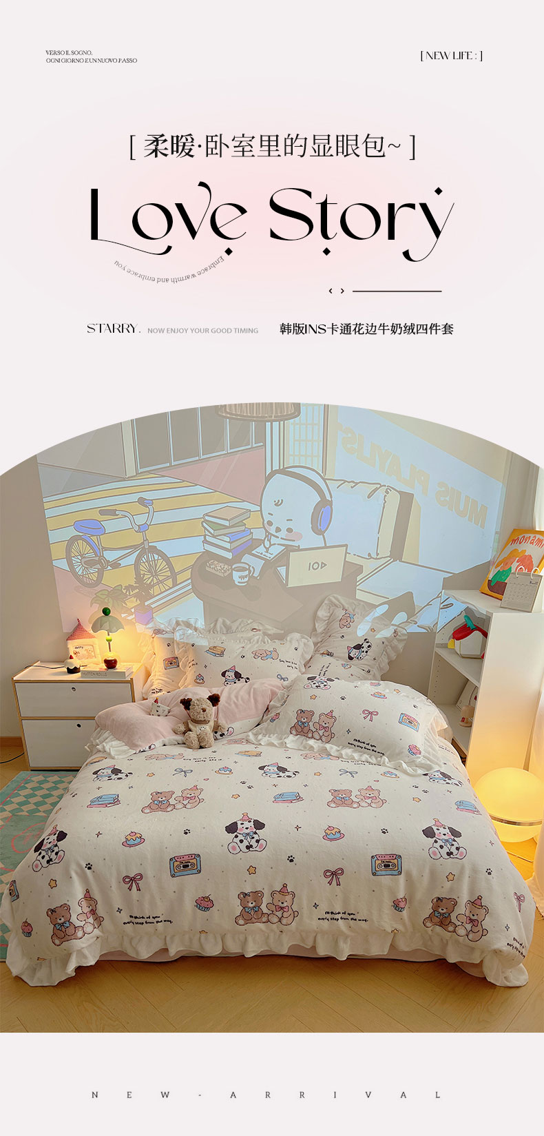 当前位置: 91家纺网 > 商品网购 > 床品套件 > 四件套 > 牛奶绒四件套 > 六巷胡同 2025新款韩式博主风花边款INS卡通A类牛奶绒四件套(第一系) 花边磁带熊仔米