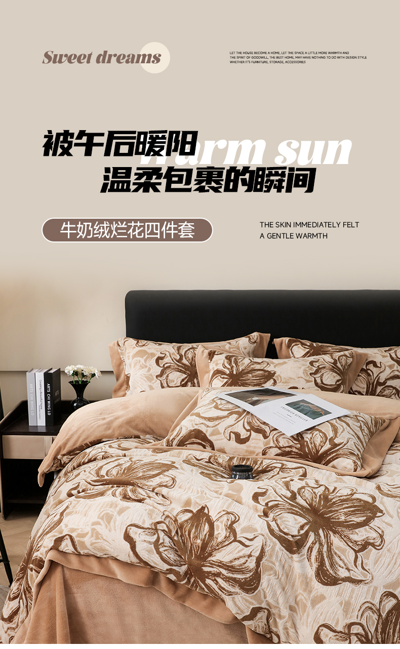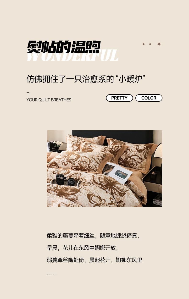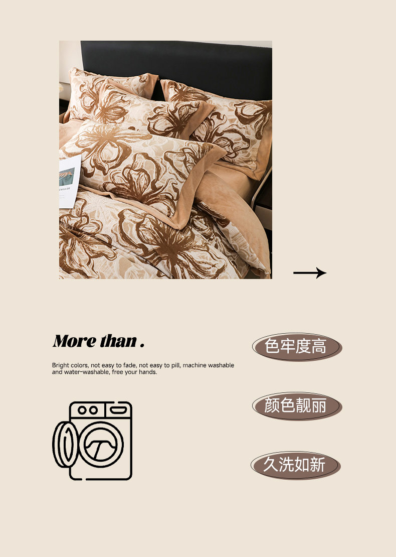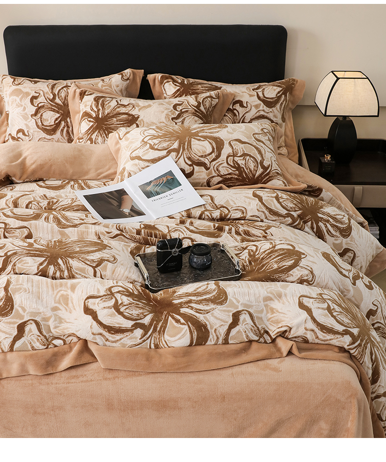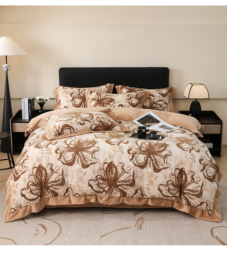 商品名称:千姿坊 2025新款冬季雕花牛奶绒加厚保暖四件套复古风轻奢烂花床单被套床上用品 优雅花卉-浅咖