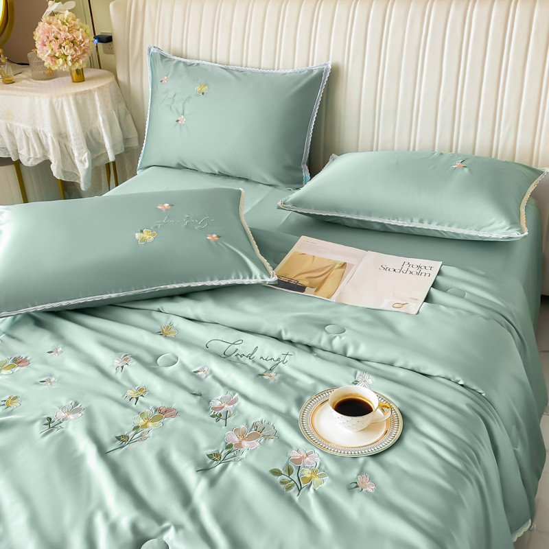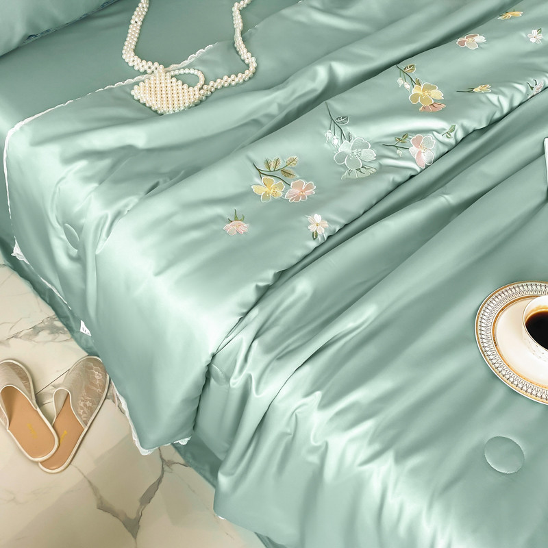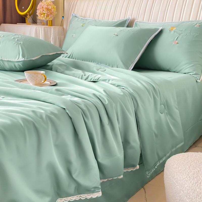 商品名称:安妮家居 2022新款水洗真丝夏被四件套 蕾丝浅绿