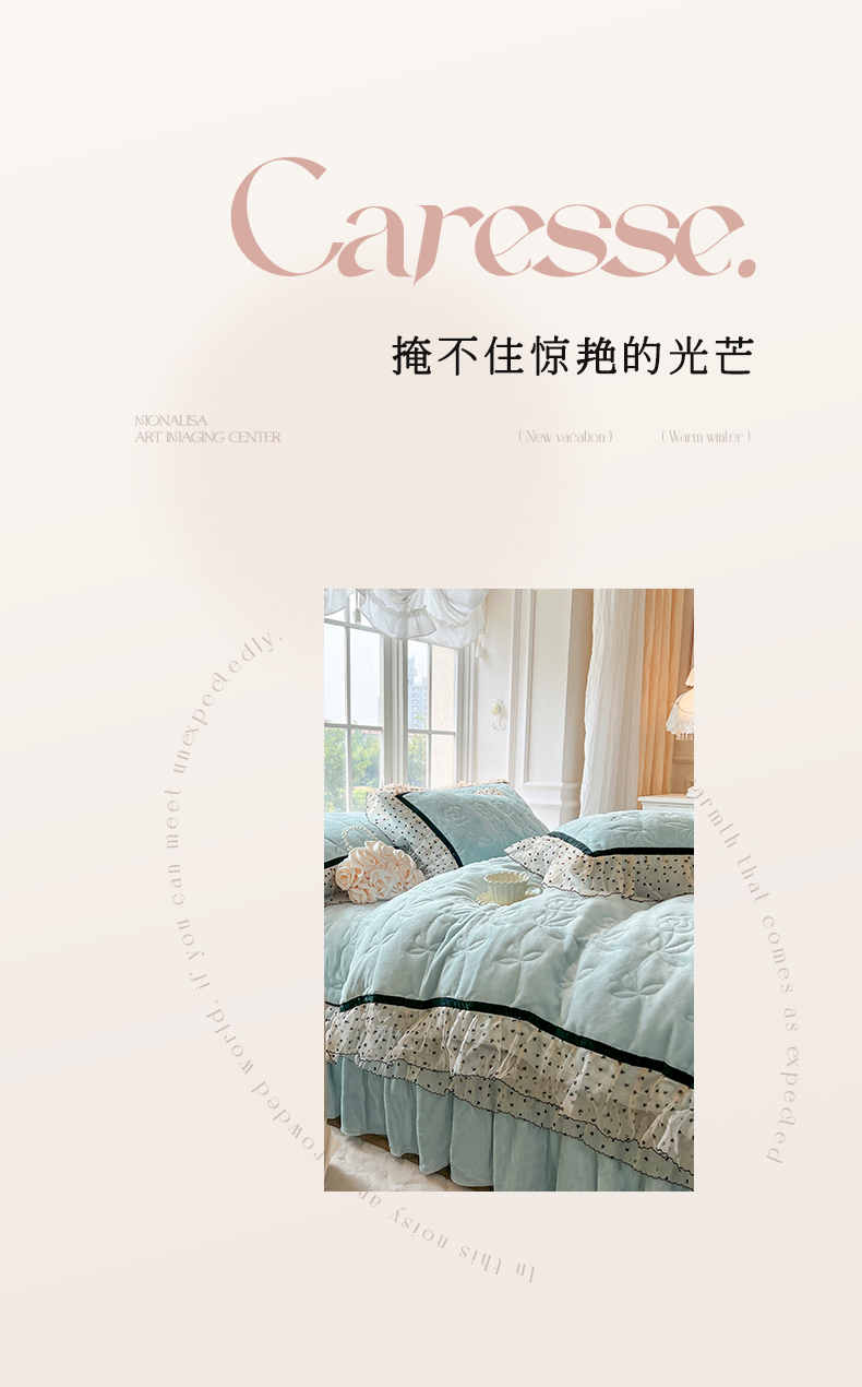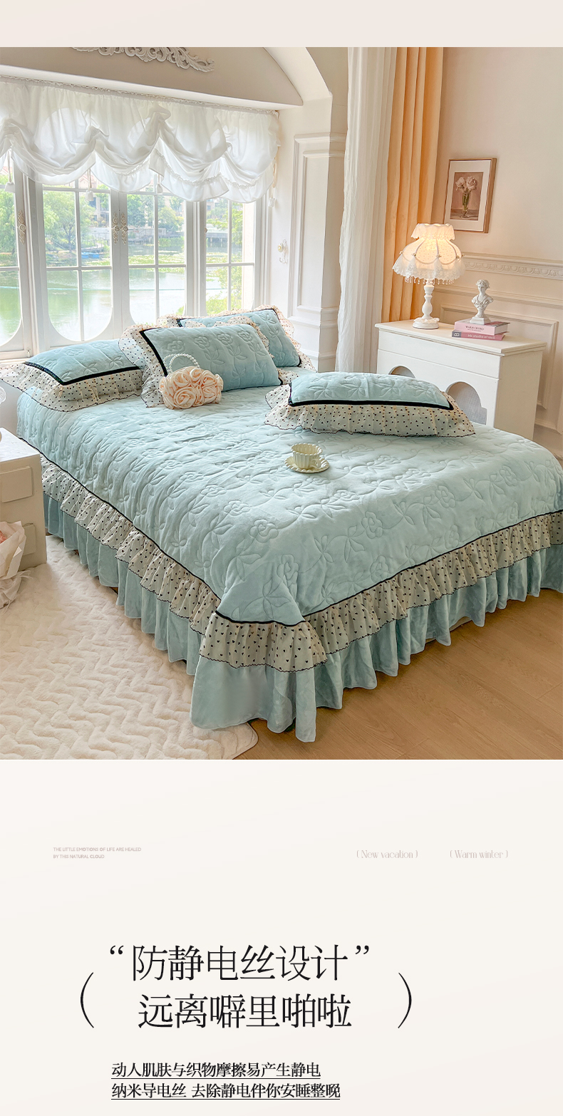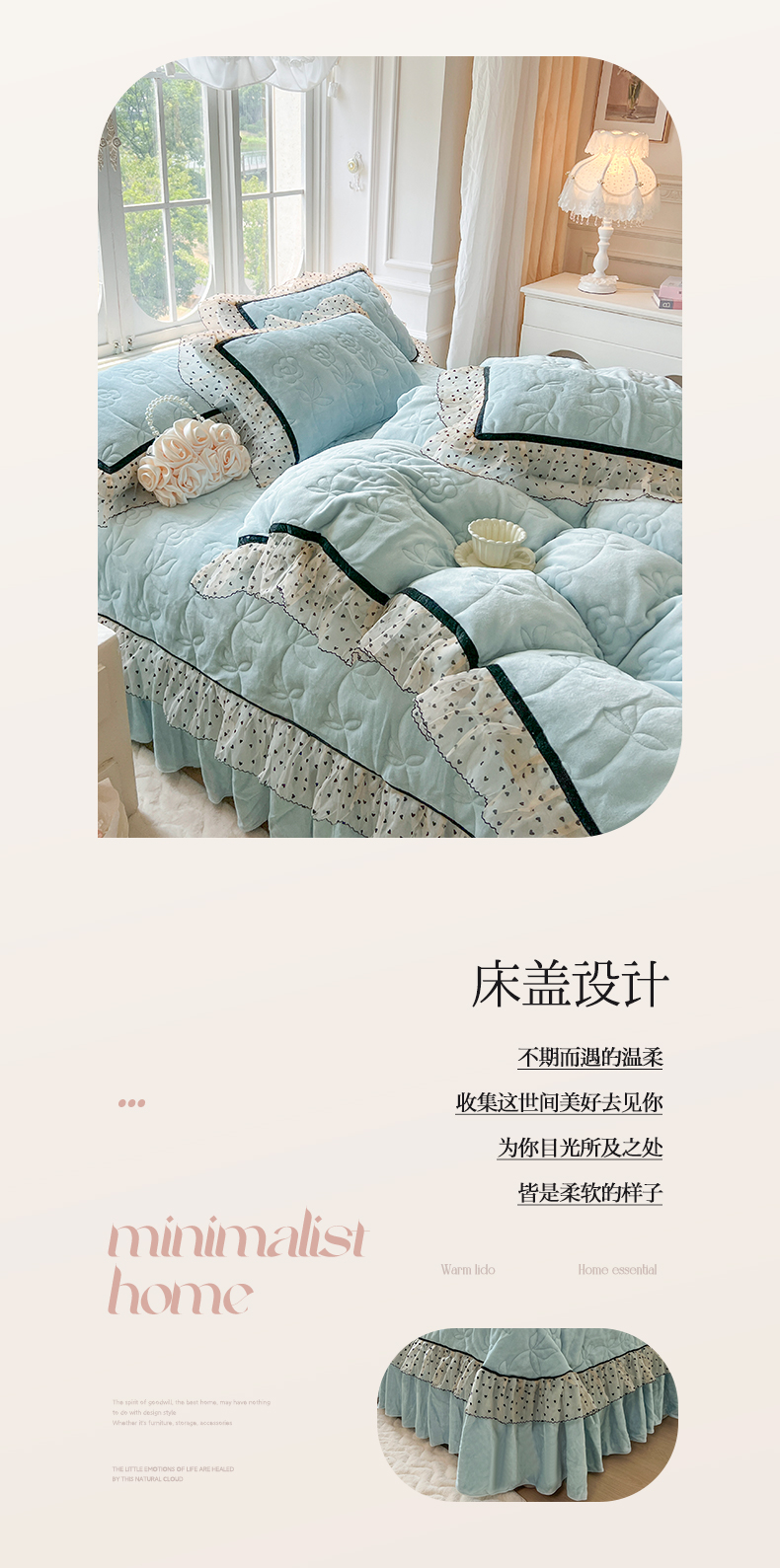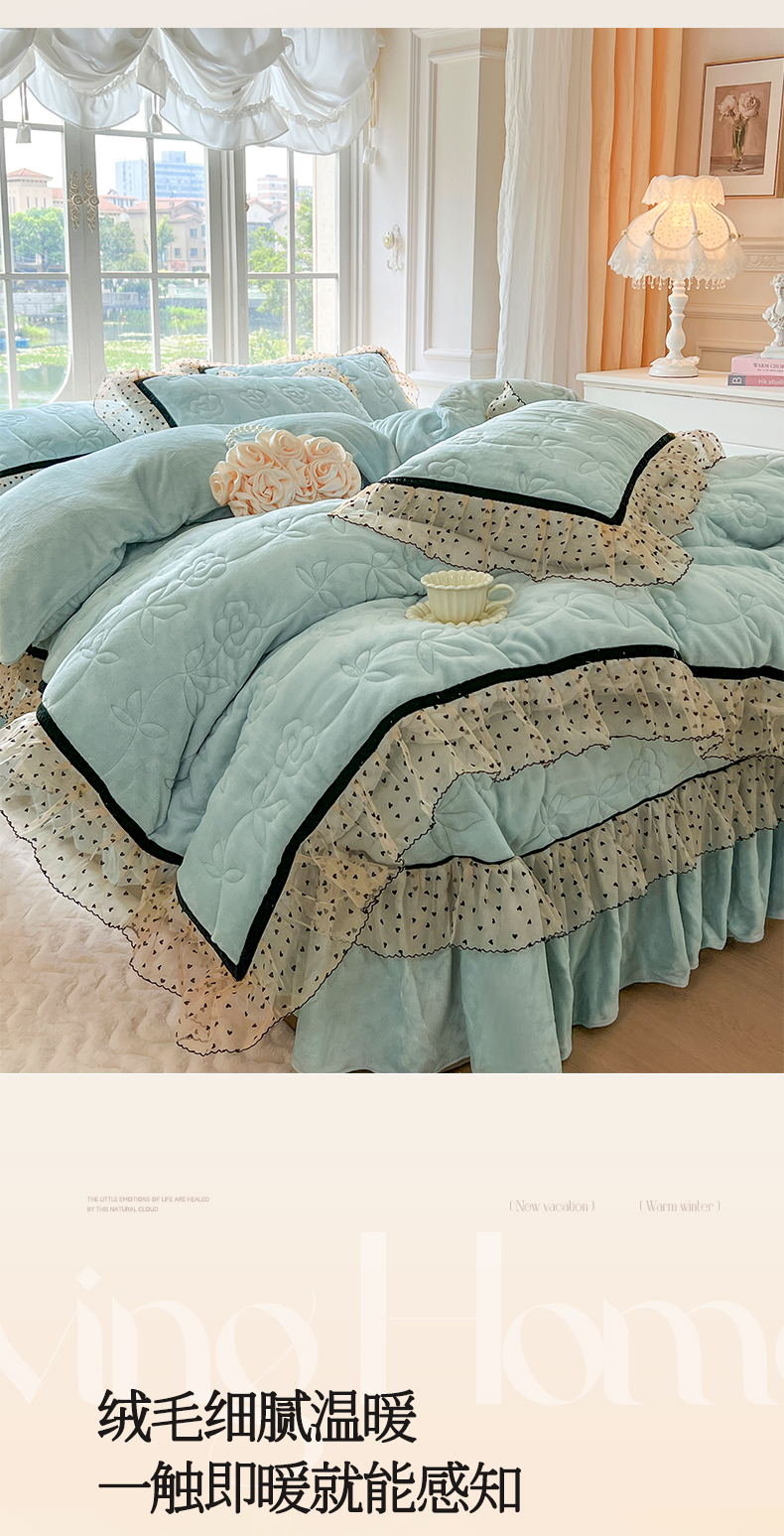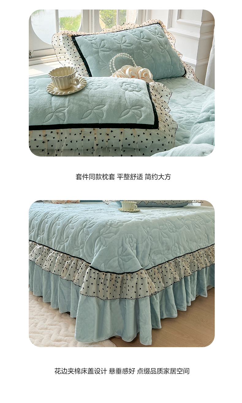 麒豆豆 2024新款高克重时尚花边牛奶绒四件套床盖款-诺蔓 诺蔓-天水绿