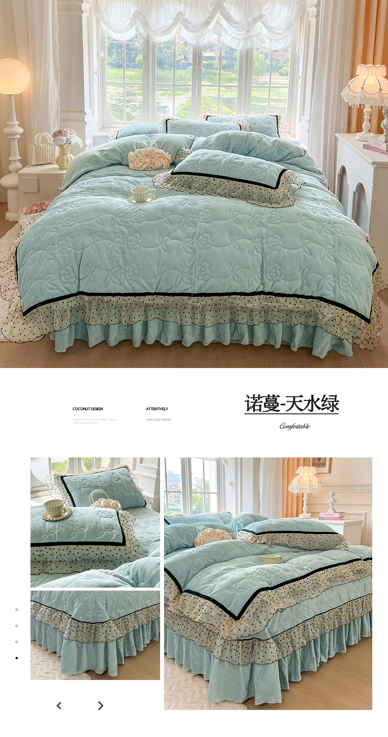 商品名称:麒豆豆 2024新款高克重时尚花边牛奶绒四件套床盖款-诺蔓 诺蔓-天水绿