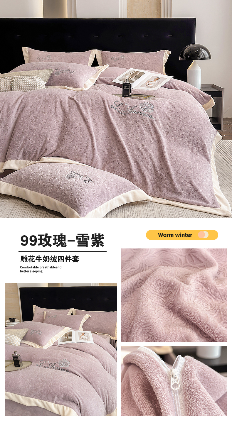 商品名称:娇逸家居 2024新款A类雕花牛奶绒拼边刺绣款-99玫瑰 99玫瑰-雪紫