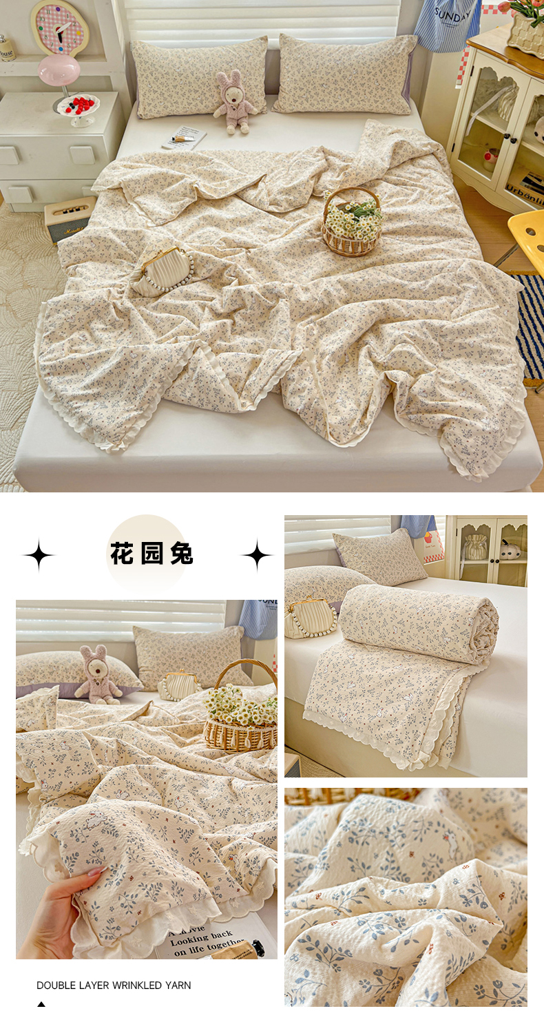 商品名称:一比一家纺 2025新款云感皱皱双层纱全棉纯棉花边单夏被夏凉被空调被系列 花园兔