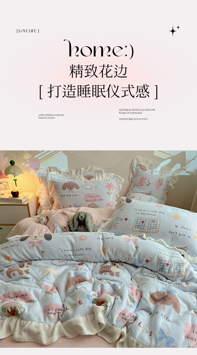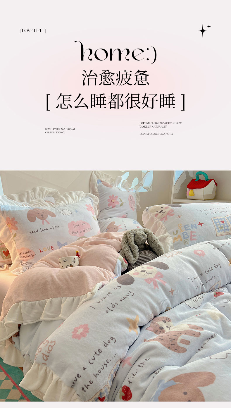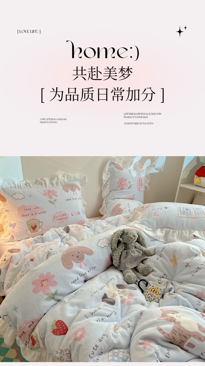 当前位置: 91家纺网 > 商品网购 > 床品套件 > 四件套 > 牛奶绒四件套 > 六巷胡同 2025新款韩式博主风花边款INS卡通A类牛奶绒四件套(第一系) 花边猫狗小课堂