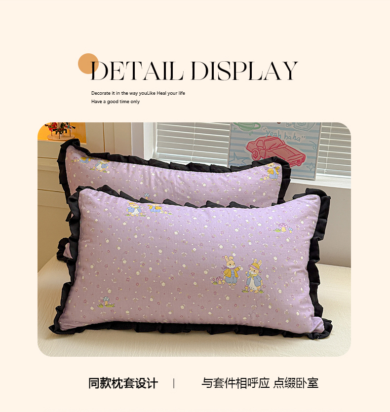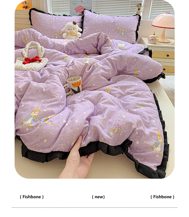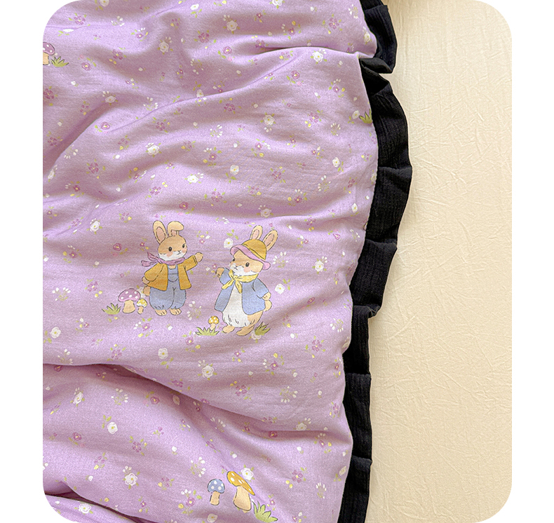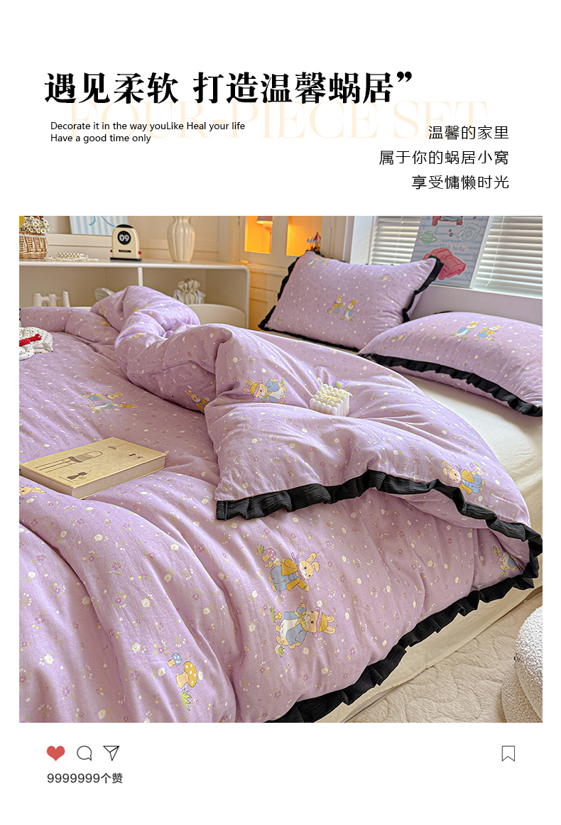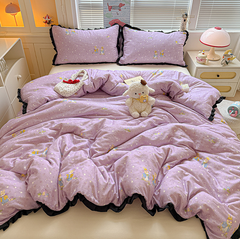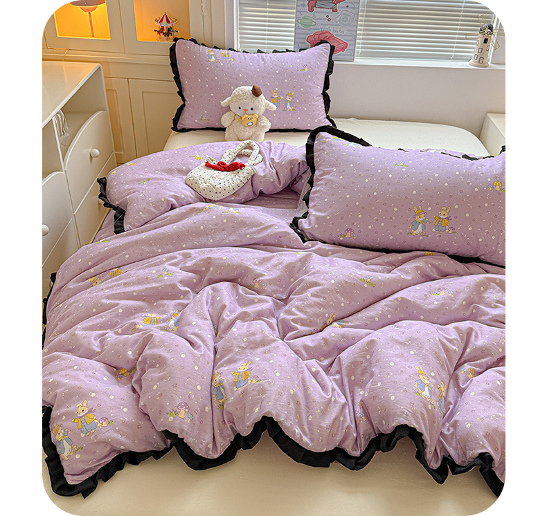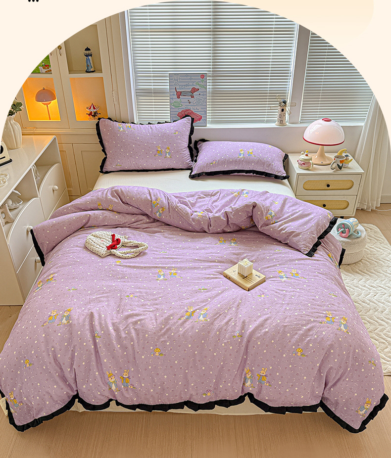 当前位置: 91家纺网 > 商品网购 > 床品套件 > 四件套 > 其它四件套 > 喜颜 2025新款超柔水洗双层纱皱皱纱花边四件套 萌兔花园-紫
