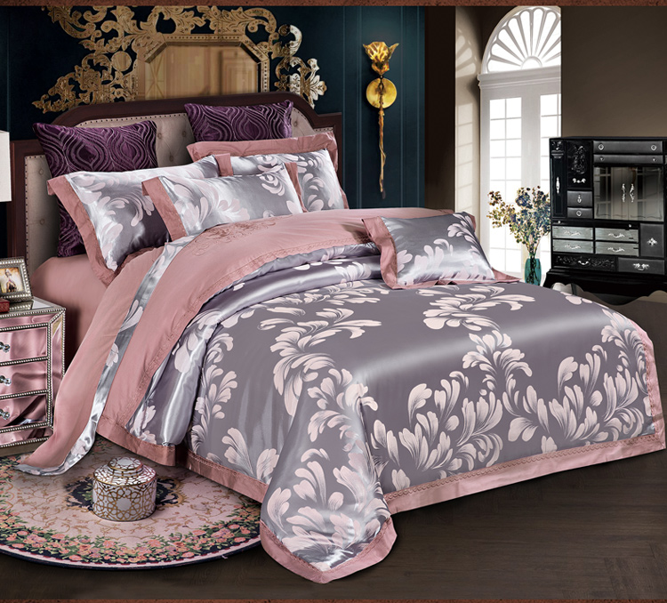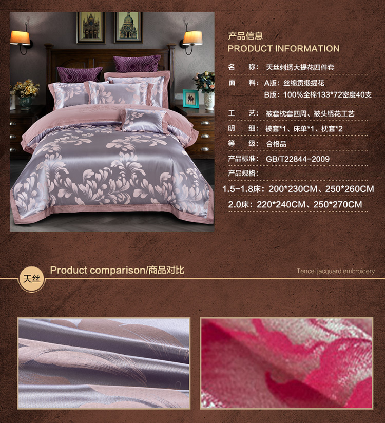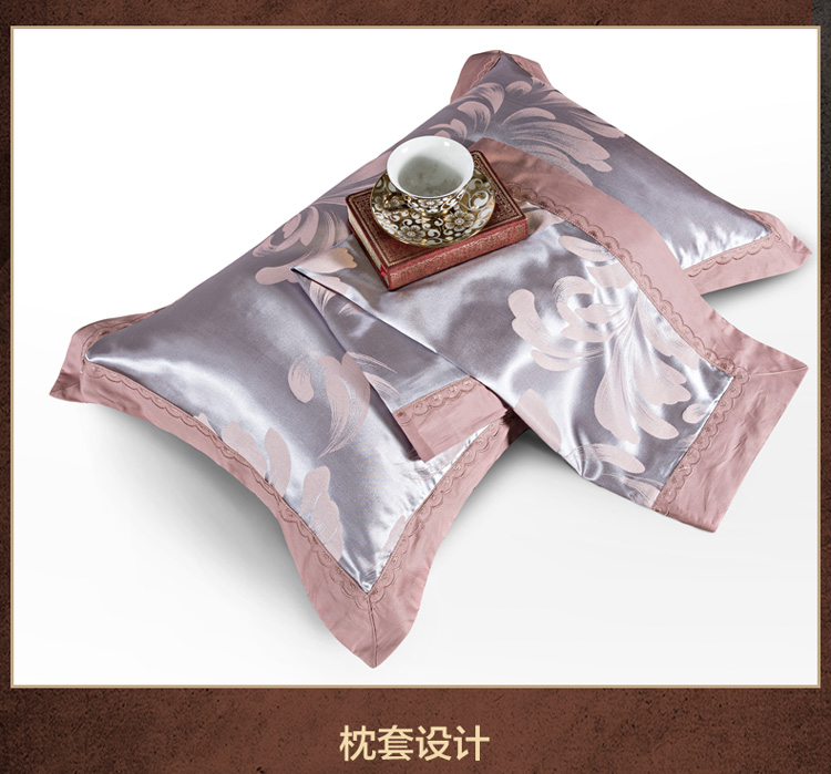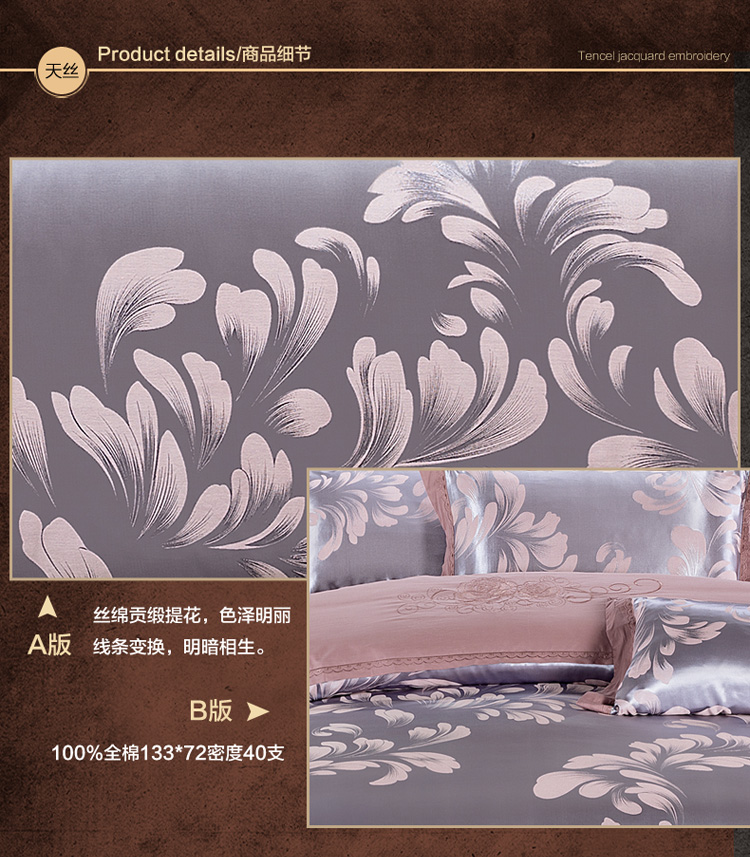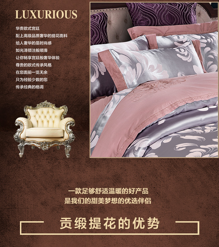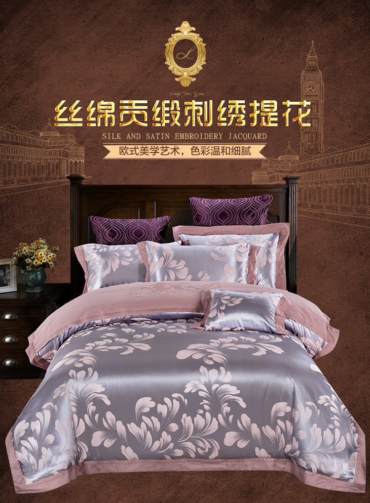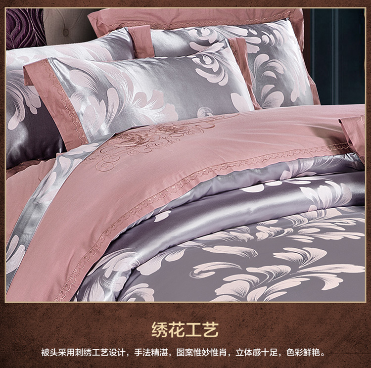 柔觉家纺 天丝刺绣贡缎提花全棉四件套,卡曼时尚-粉紫