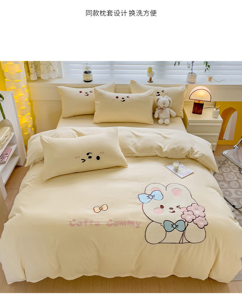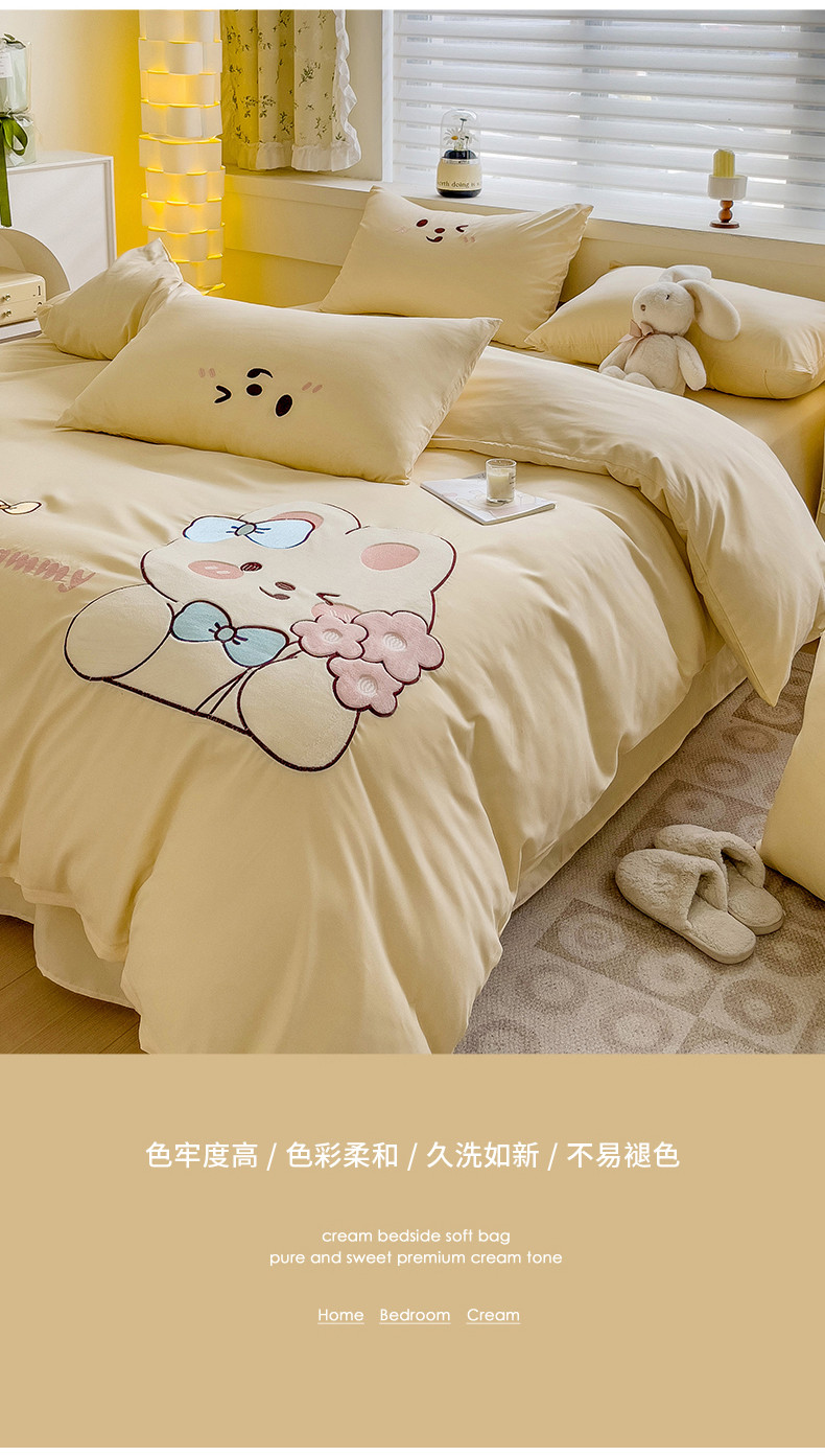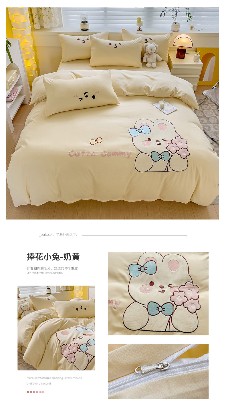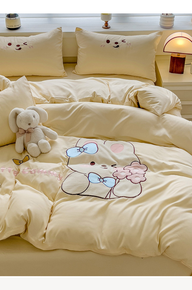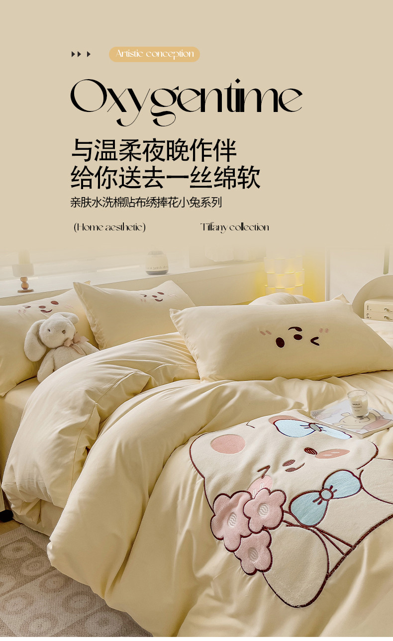 N先生2024秋冬亲肤水洗棉贴布绣四件套-捧花小兔系列 捧花小兔-奶黄
