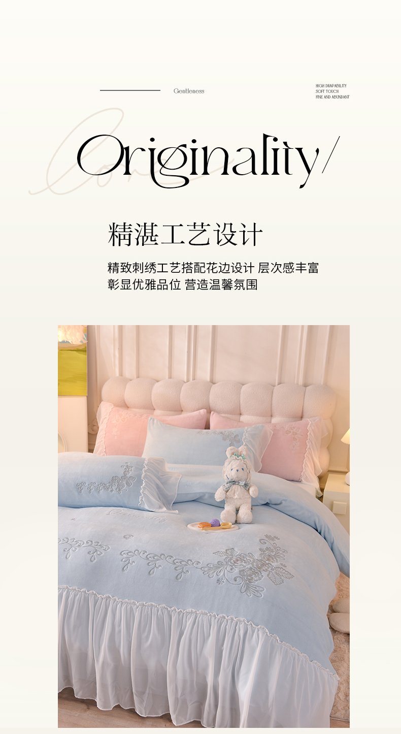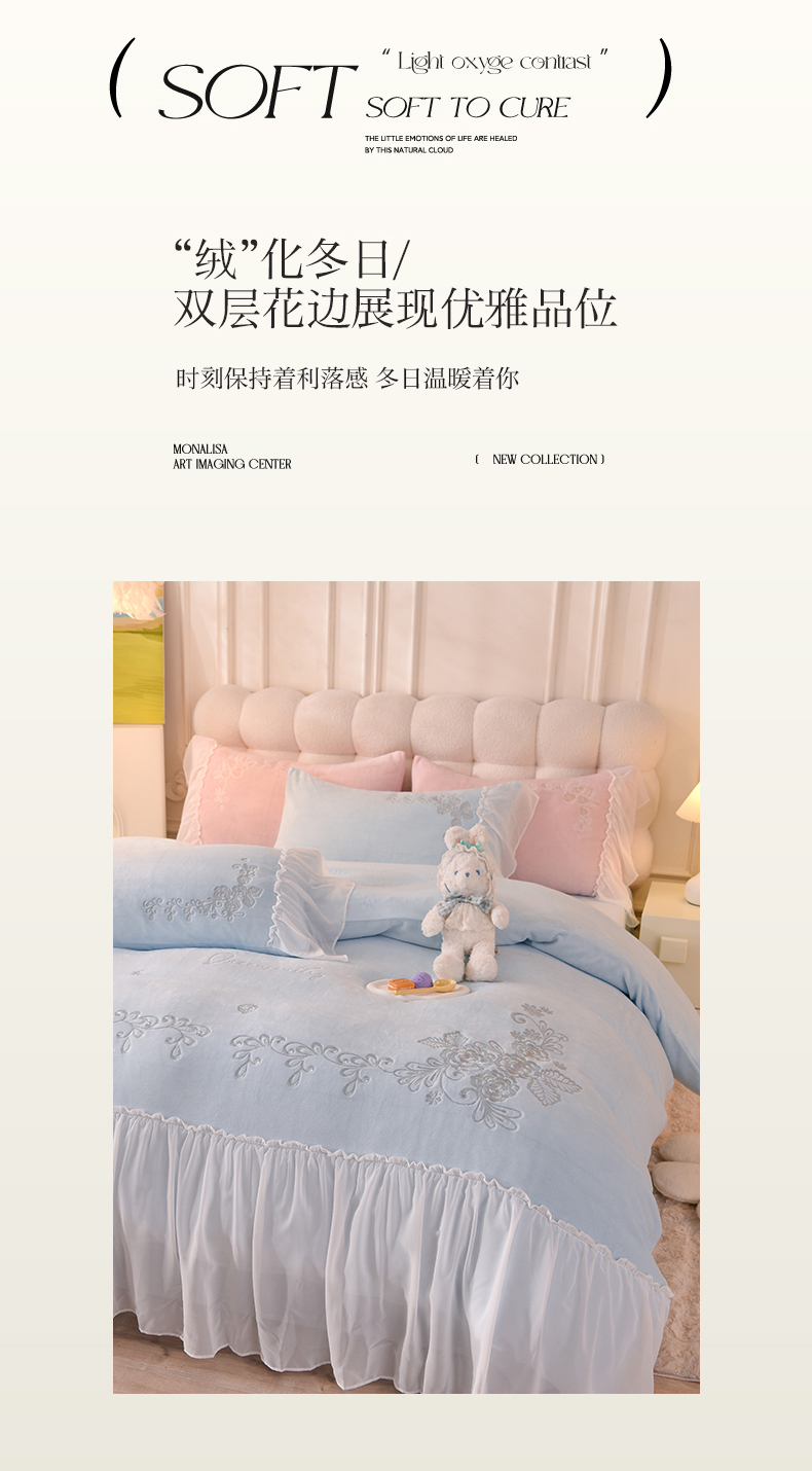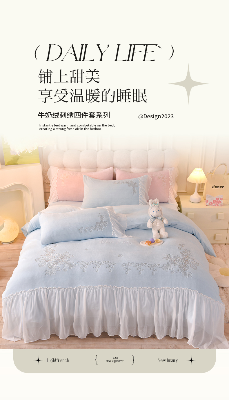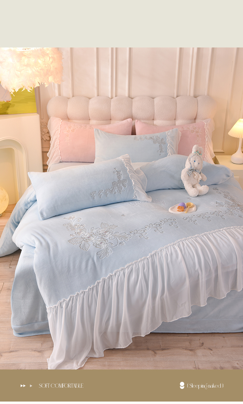 商品名称:迪欧芙 2023新款牛奶绒工艺款四件套-花恋 天空蓝