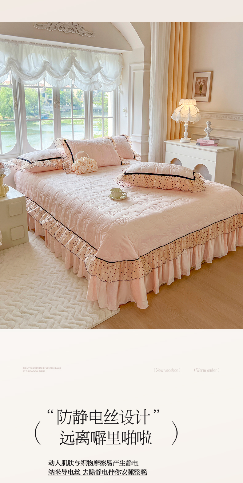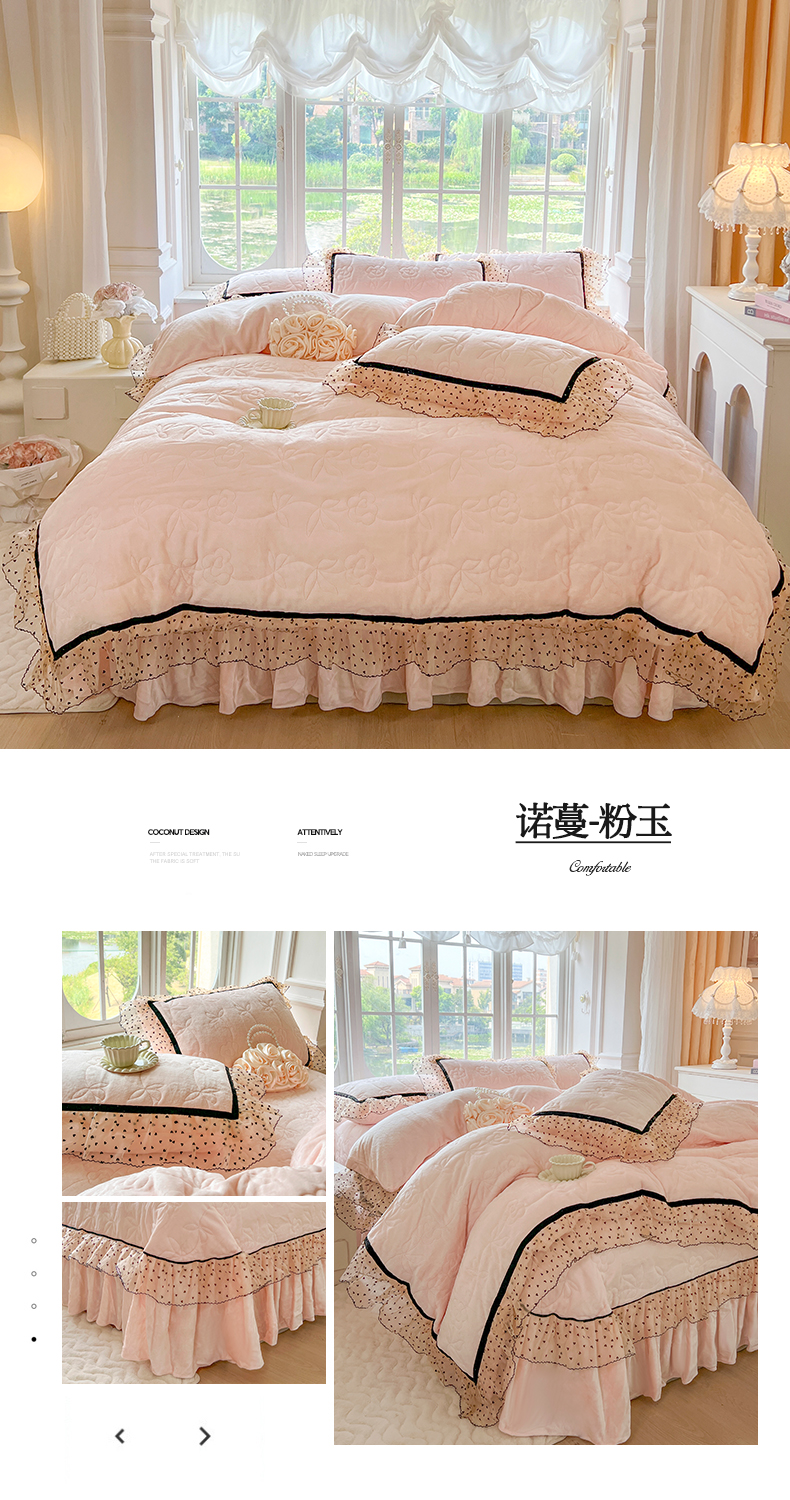 商品名称:麒豆豆 2024新款高克重时尚花边牛奶绒四件套床盖款-诺蔓 诺蔓-粉玉