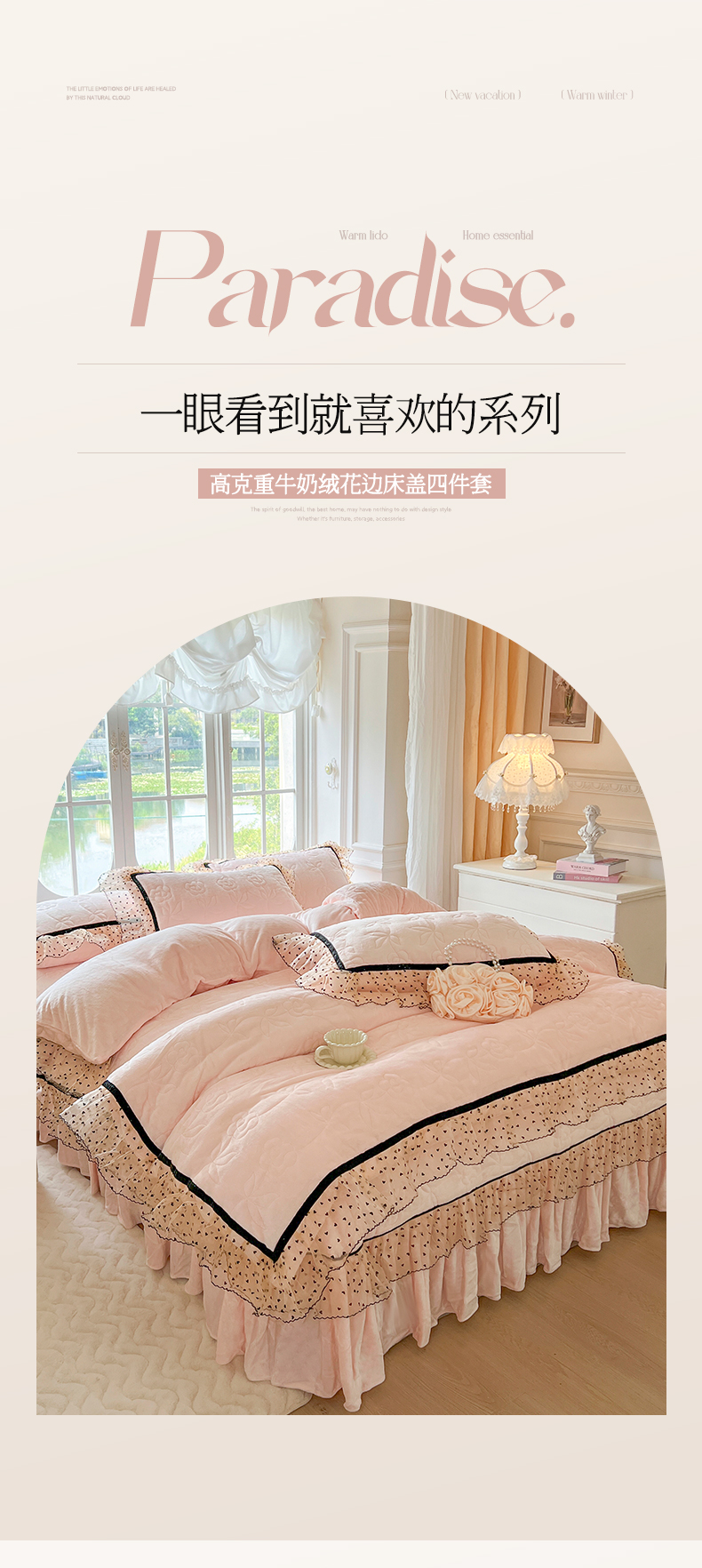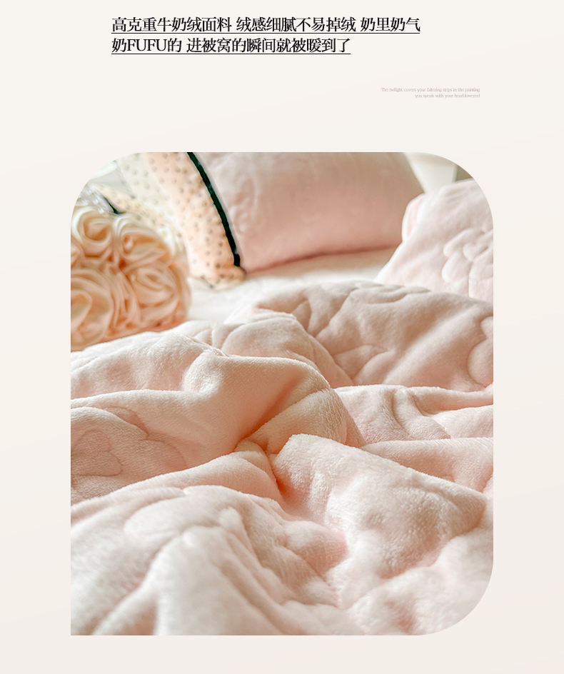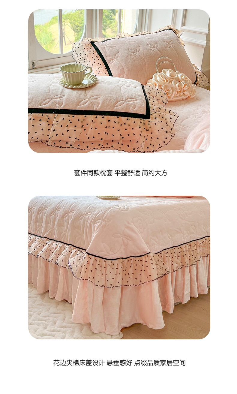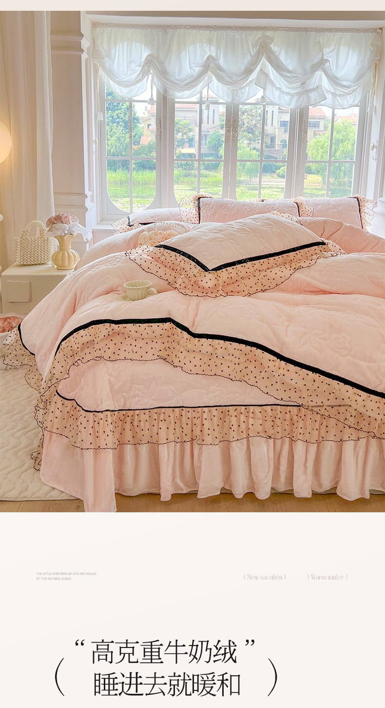 麒豆豆 2024新款高克重时尚花边牛奶绒四件套床盖款-诺蔓 诺蔓-粉玉