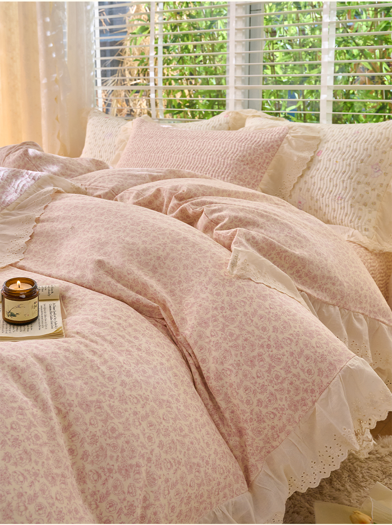• 91家纺网 家纺一手货源 找家纺 X猫先生 2025新款法式全棉双层纱床盖套件夹棉床单三四件套(A类母婴级) 玫瑰庄园