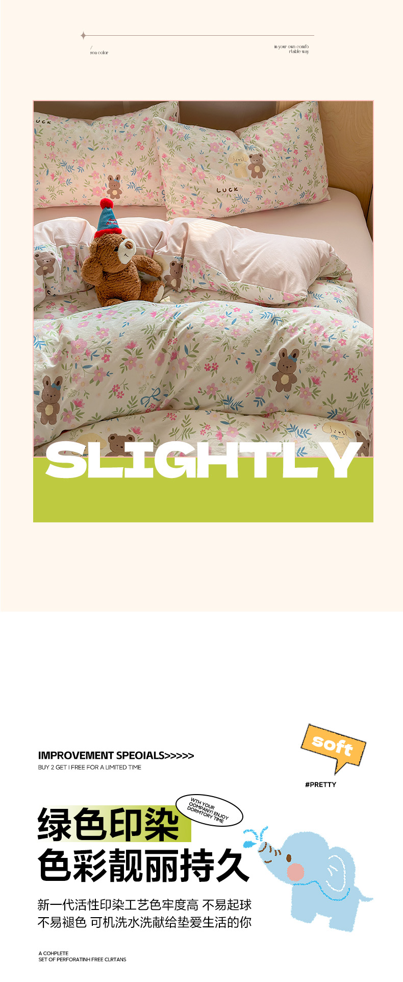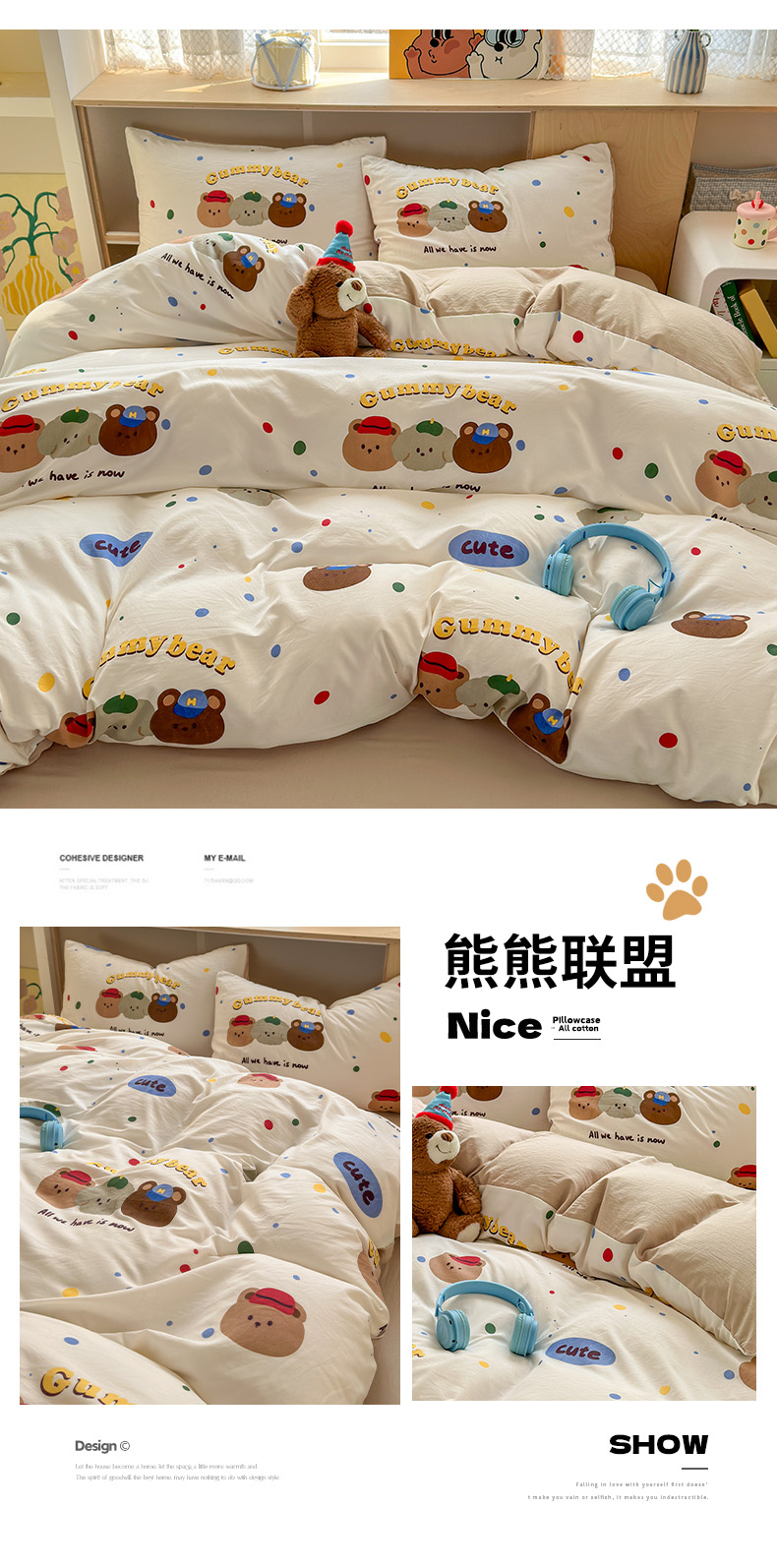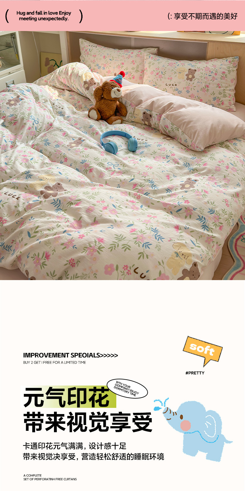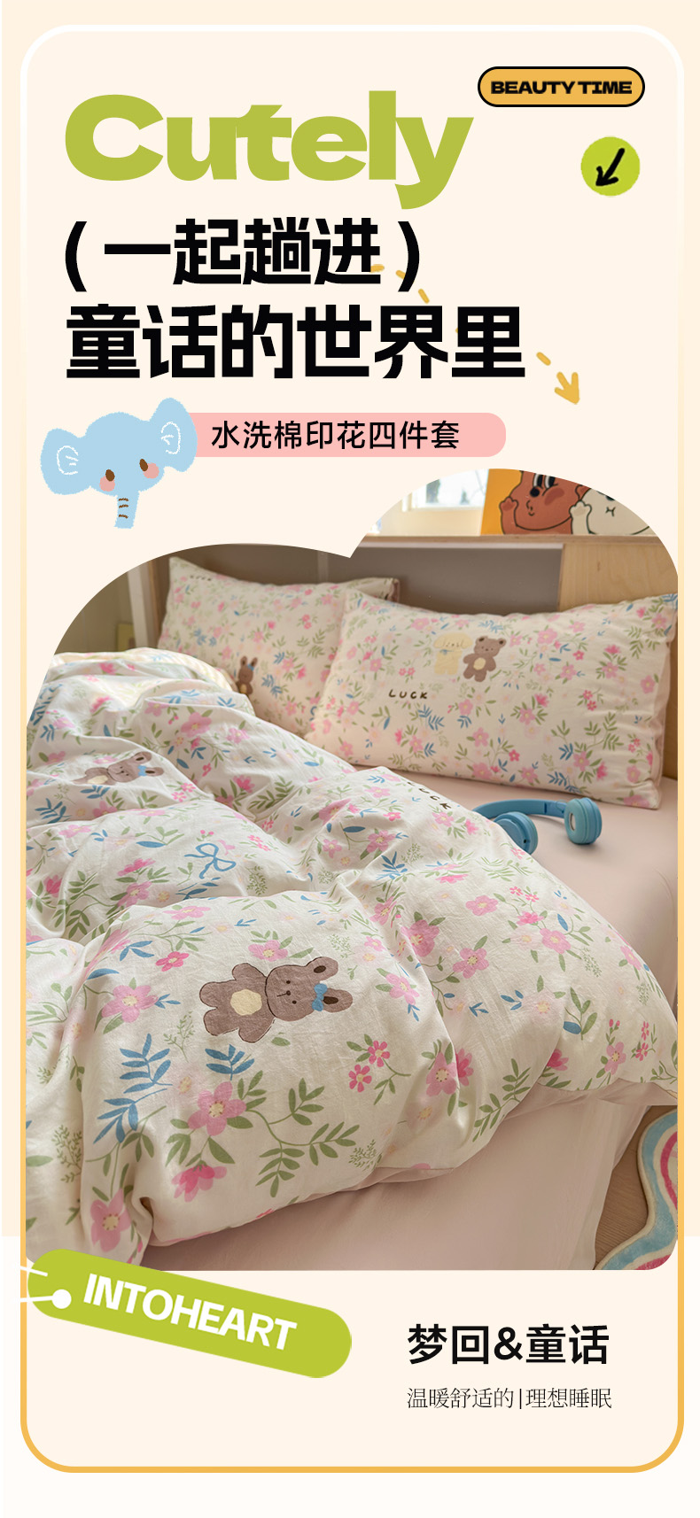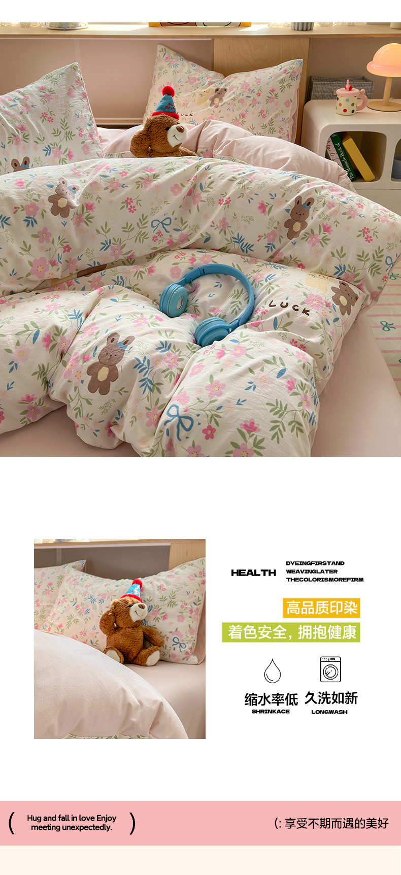 商品名称:冕悠家纺 2025新款A类高克重糯叽叽超柔糯水洗棉印花四件套-单被套 熊熊花语