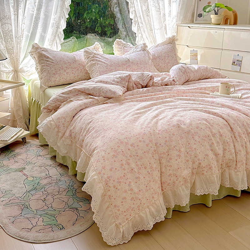 仟网汇 2025新款皱皱纱花边床裙四件套多功能夏被夏凉被空调被四件套四季通用 桃花灼灼