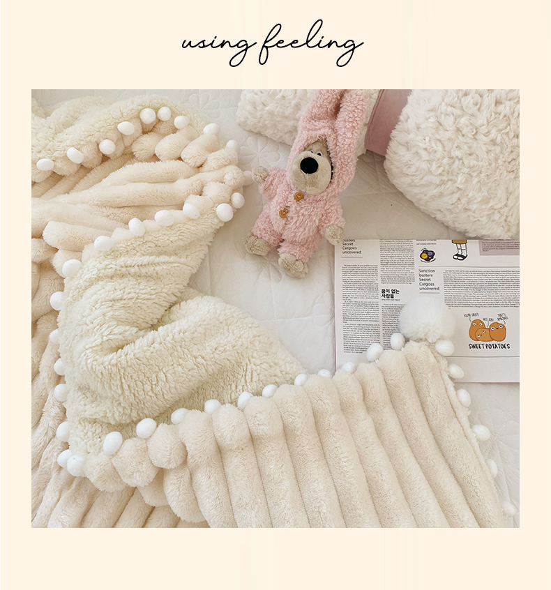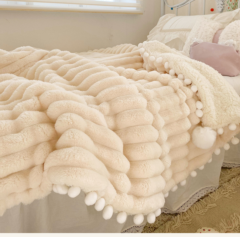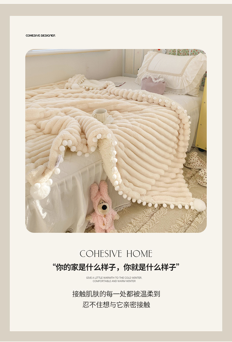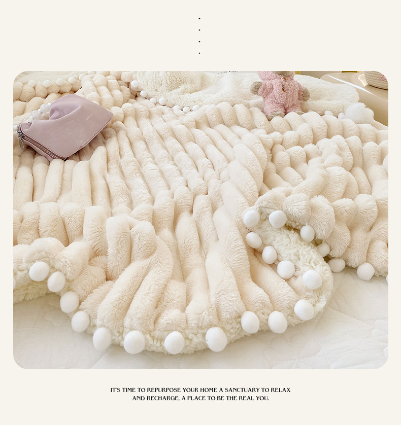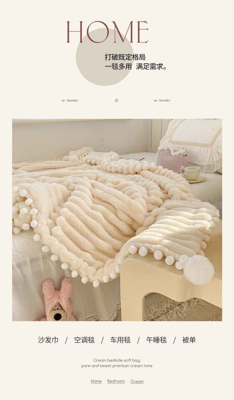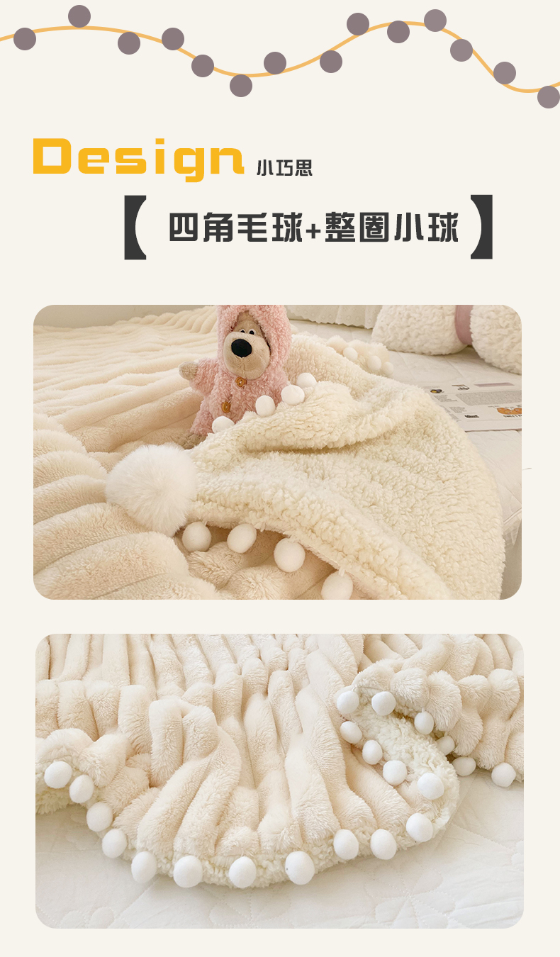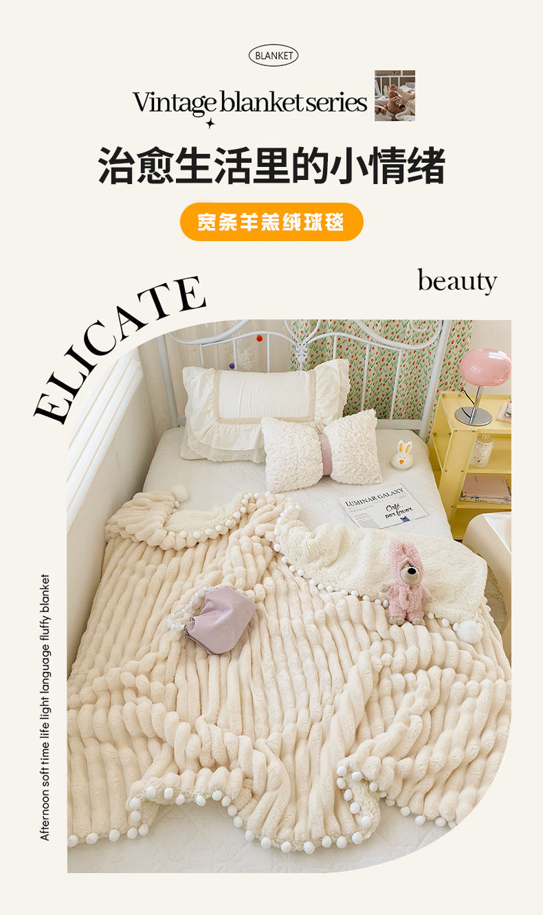 潮邦创意家居 2025新款宽条球毯大抽条配羊羔绒立体工艺绒毯毛毯盖毯 宽条球毯白