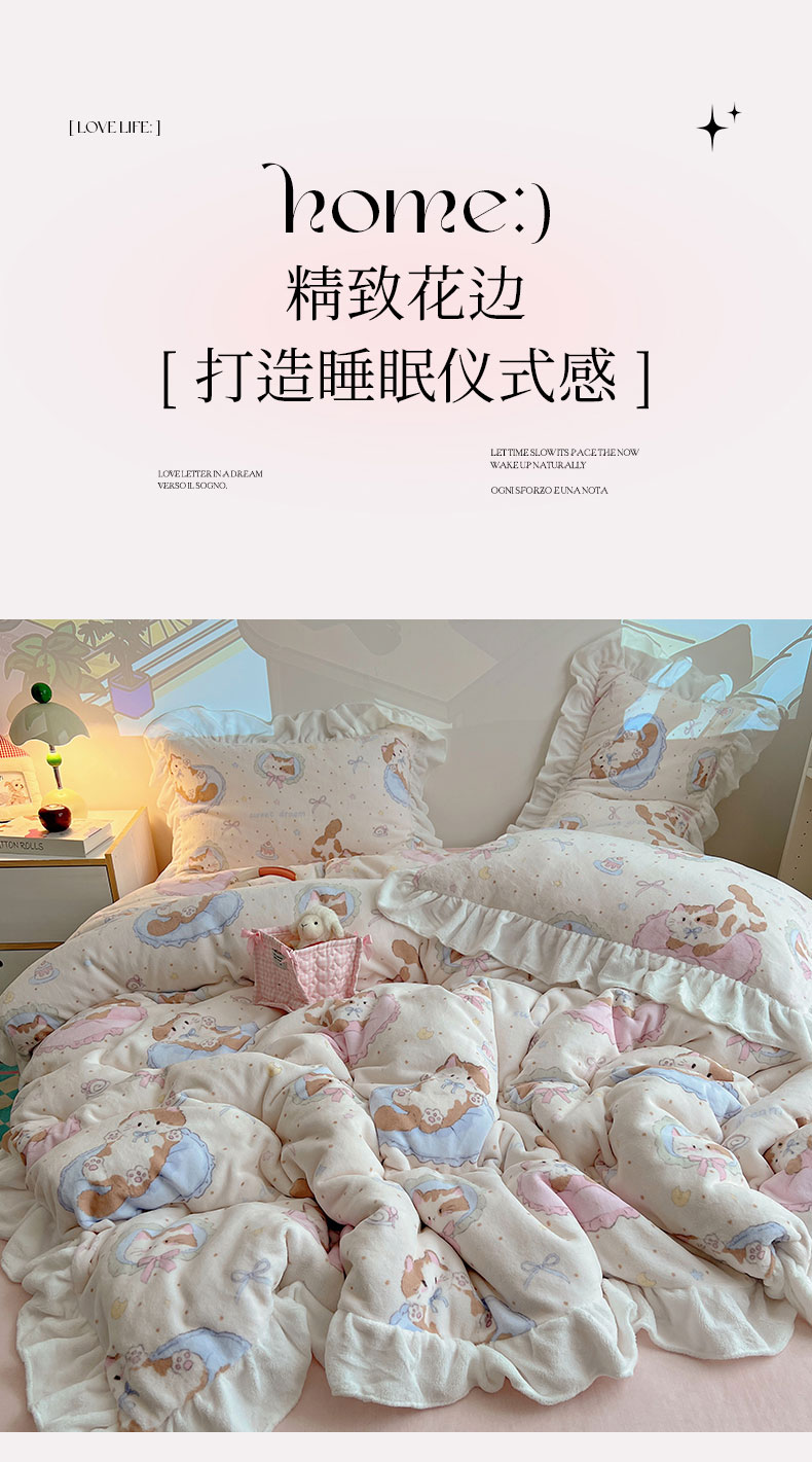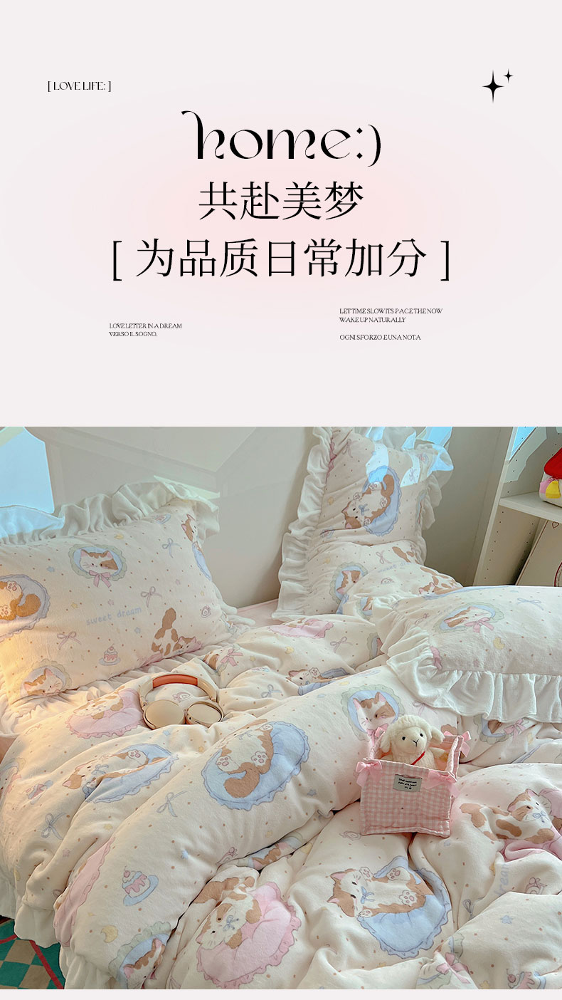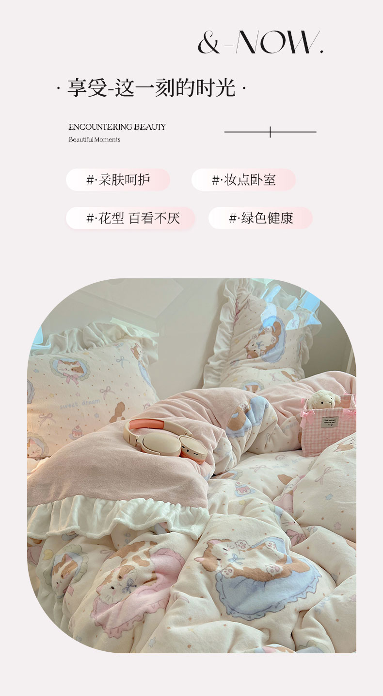 当前位置: 91家纺网 > 商品网购 > 床品套件 > 四件套 > 牛奶绒四件套 > 六巷胡同 2025新款韩式博主风花边款INS卡通A类牛奶绒四件套(第一系) 花边萝莉猫咪崽
