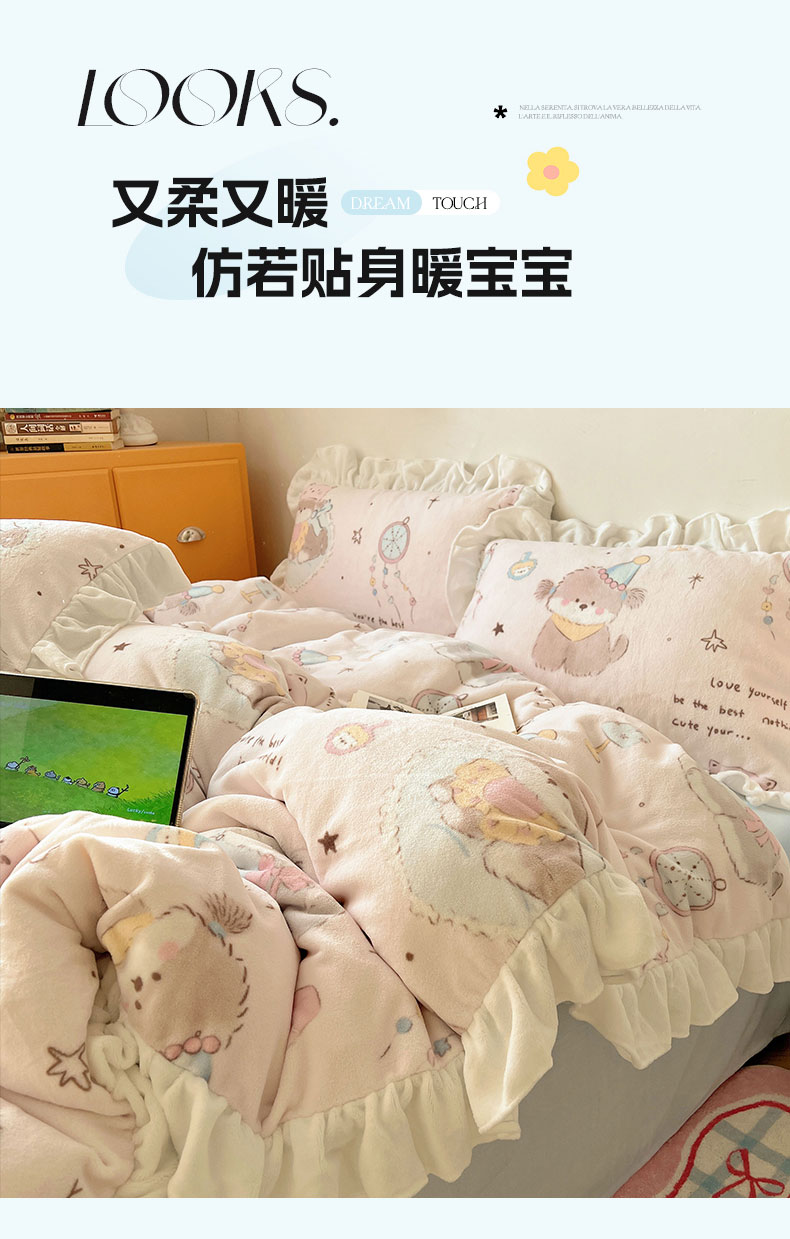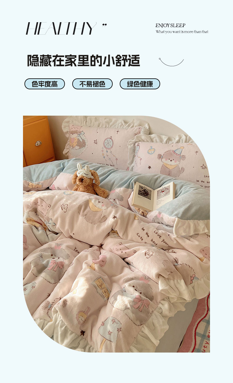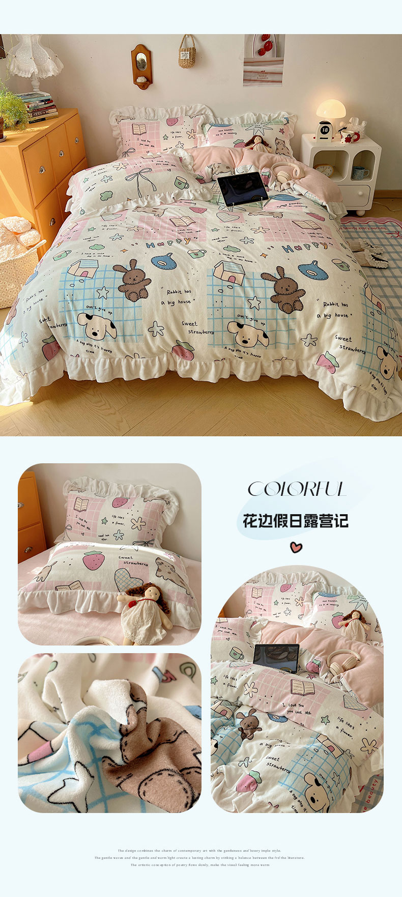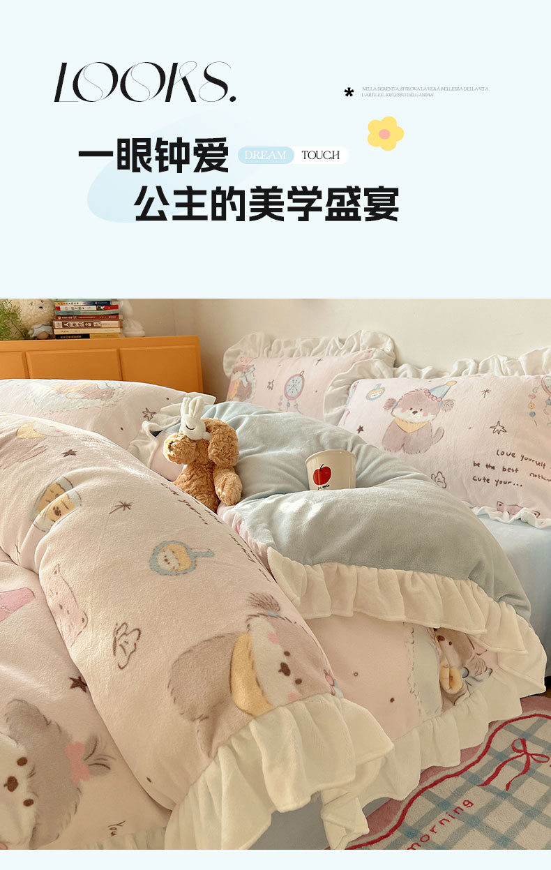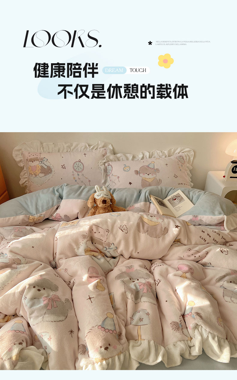 当前位置: 91家纺网 > 商品网购 > 床品套件 > 四件套 > 牛奶绒四件套 > 六巷胡同 2025新款韩式博主风花边款INS卡通牛奶绒四件套(第二系) 花边卧室课本犬