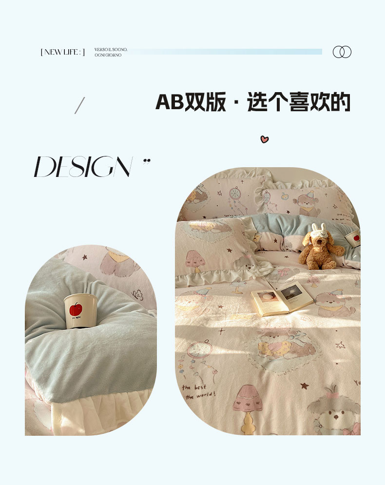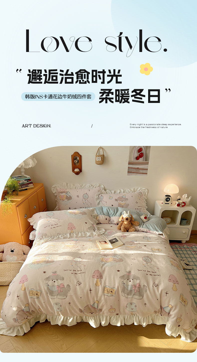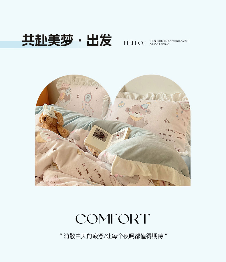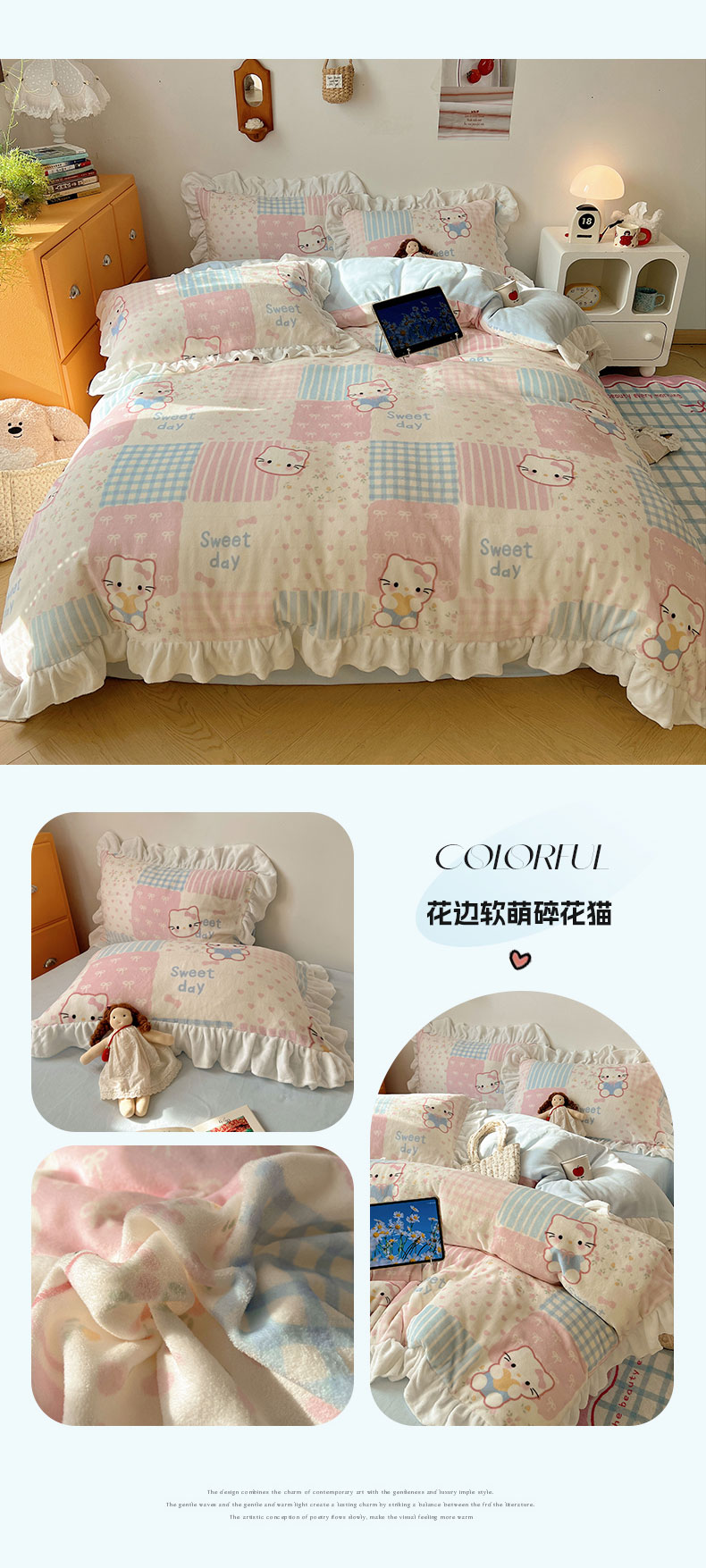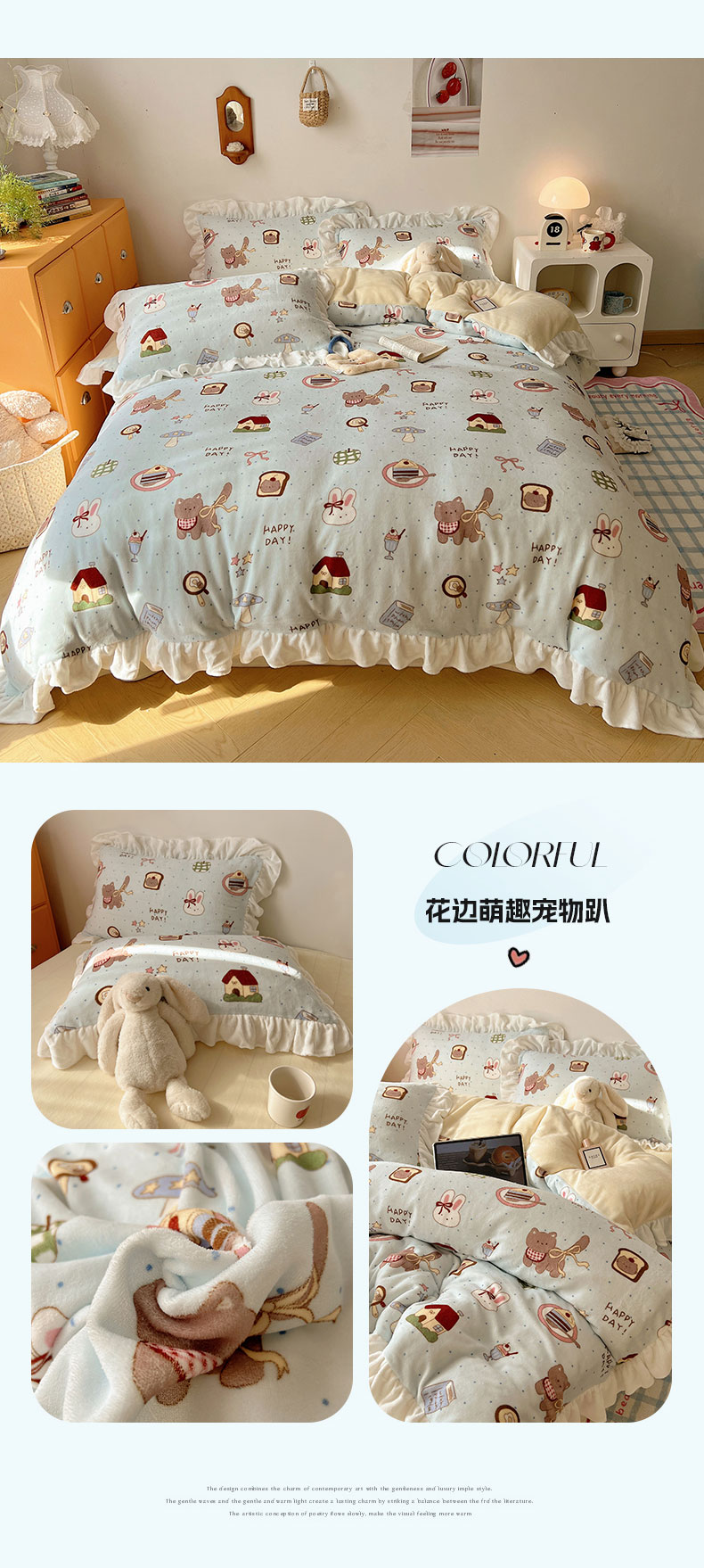 当前位置: 91家纺网 > 商品网购 > 床品套件 > 四件套 > 牛奶绒四件套 > 六巷胡同 2025新款韩式博主风花边款INS卡通牛奶绒四件套(第二系) 花边卧室课本犬