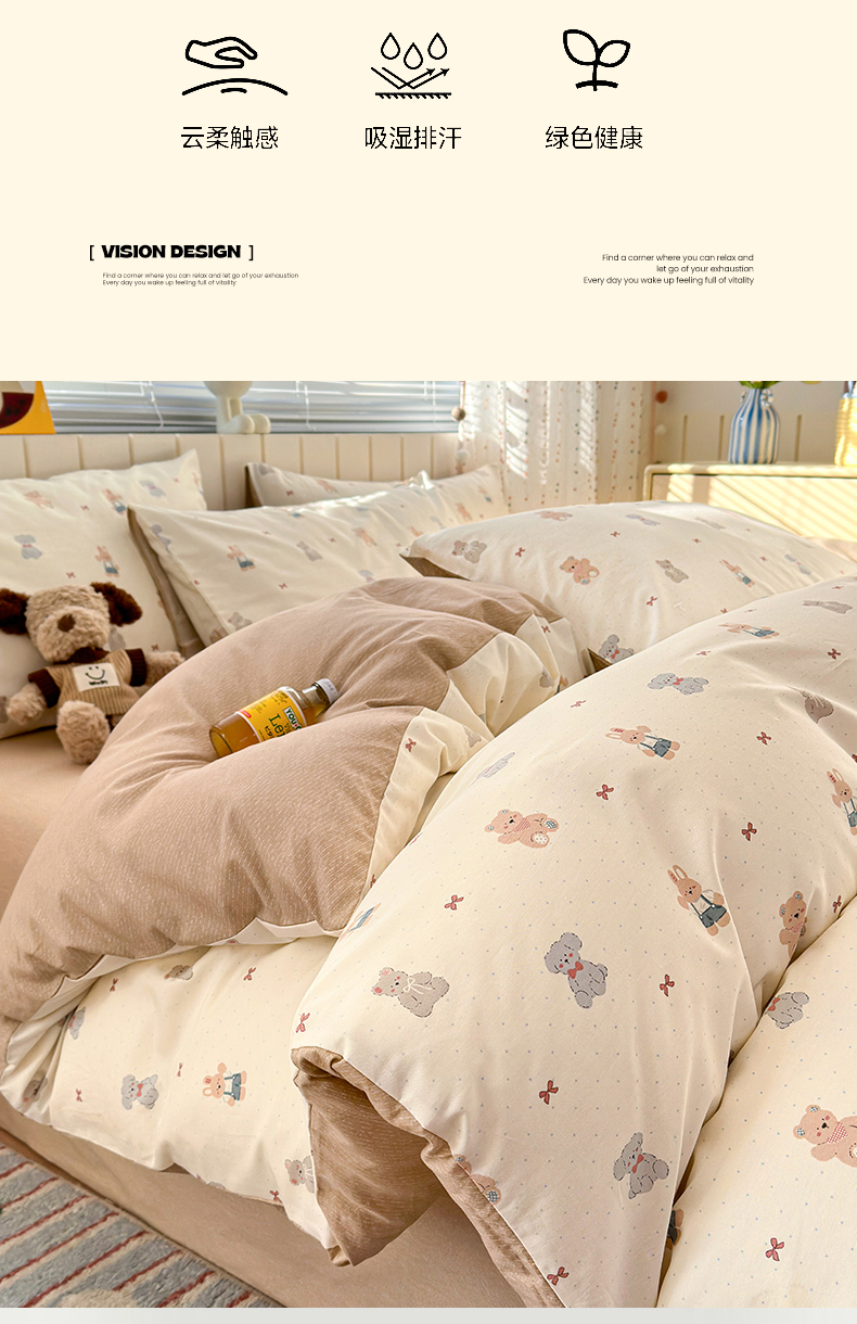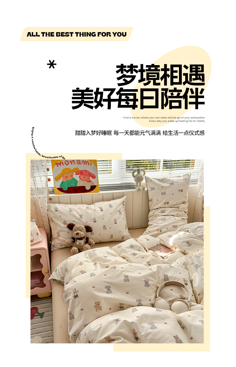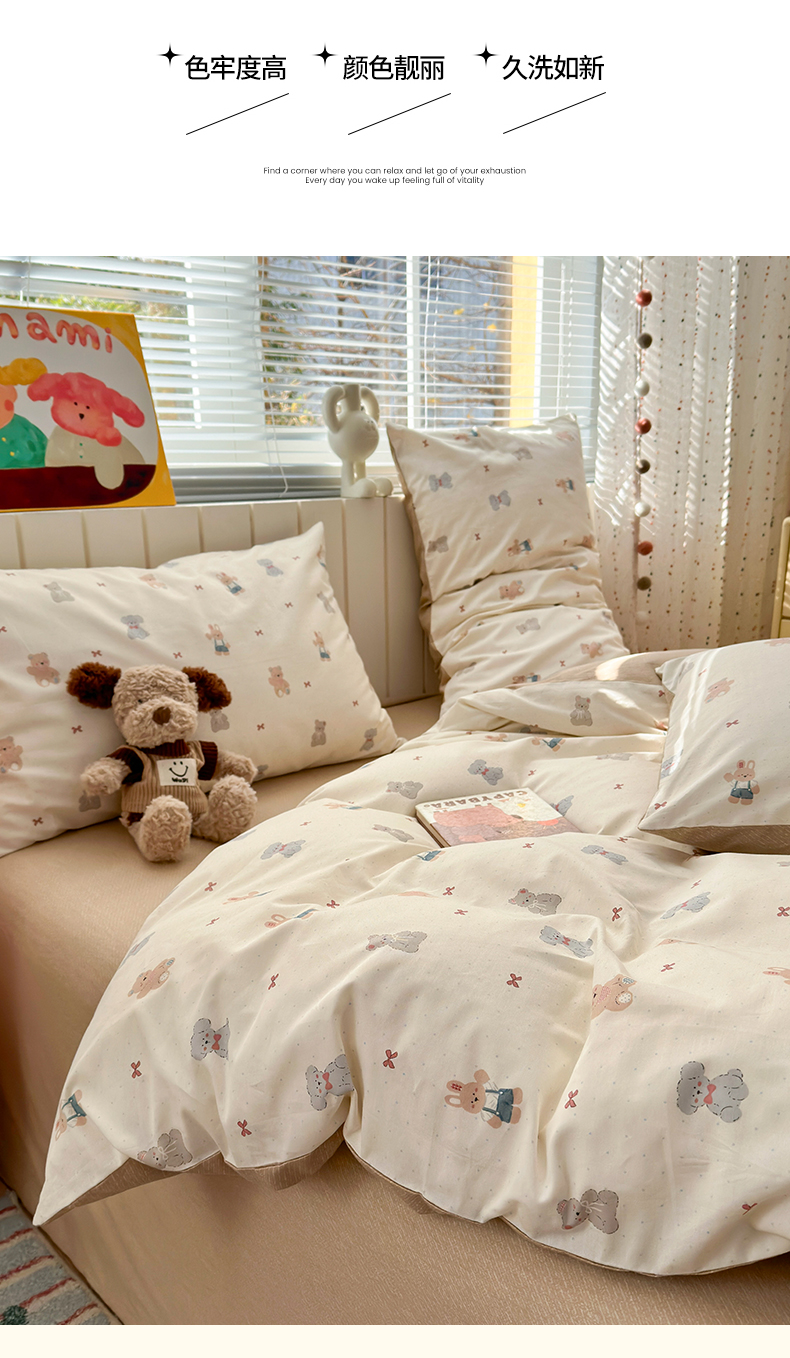 当前位置: 91家纺网 > 商品网购 > 床品套件 > 四件套 > 全棉普通四件套 > 清雅福 2026春夏新款INS小清新40支全棉13372四件套第一批 豆丁小熊