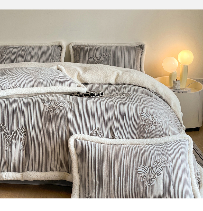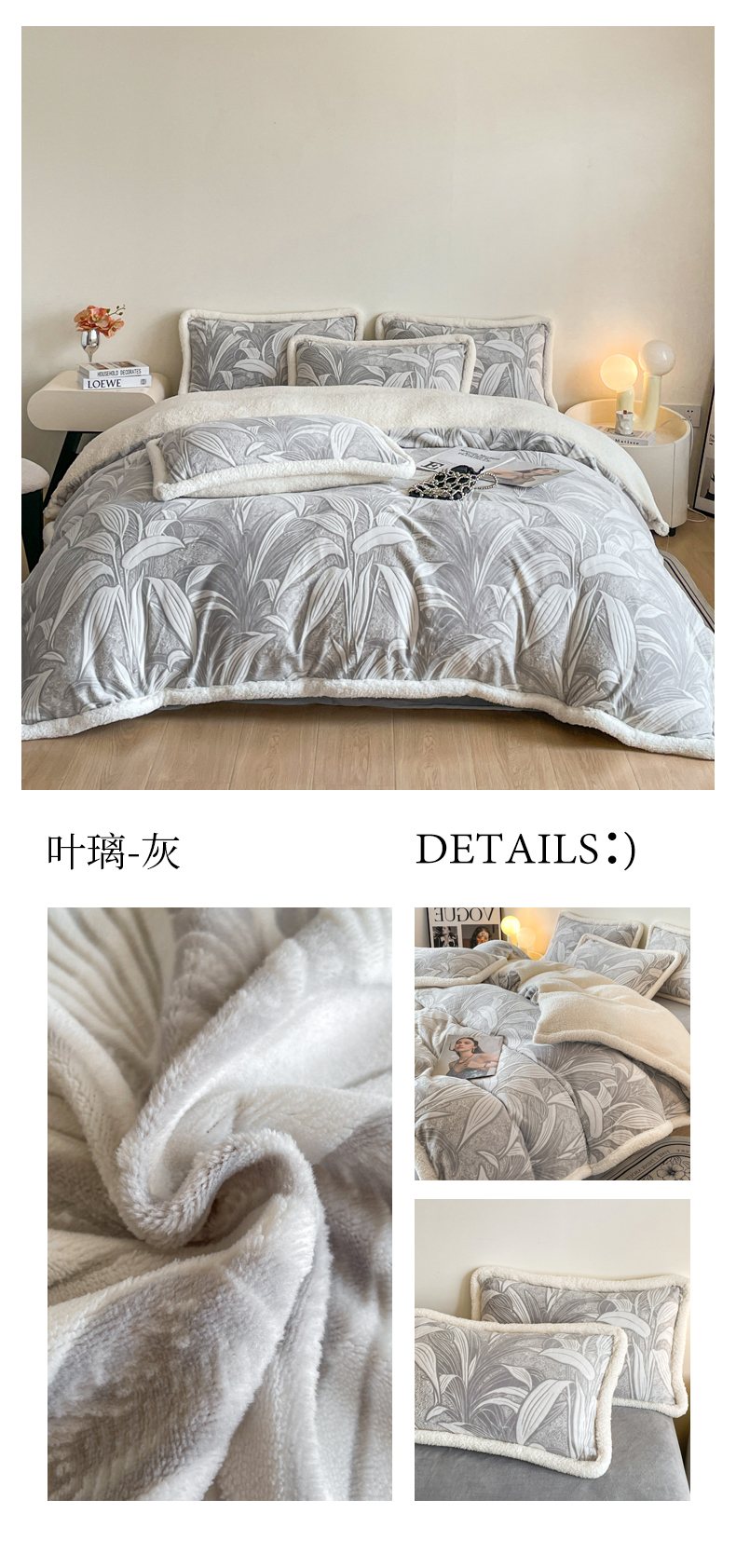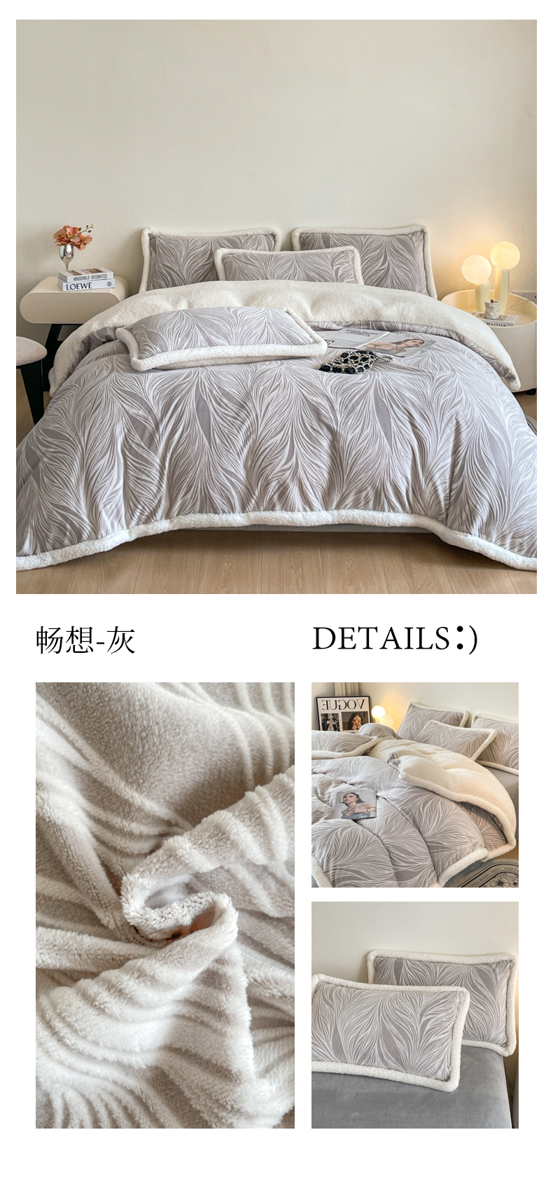 商品名称:慕晨 2024新款A类高克重简奢雕花牛奶绒240G羊羔绒双面加厚被套绒四件套 森林狂想曲-蓝灰