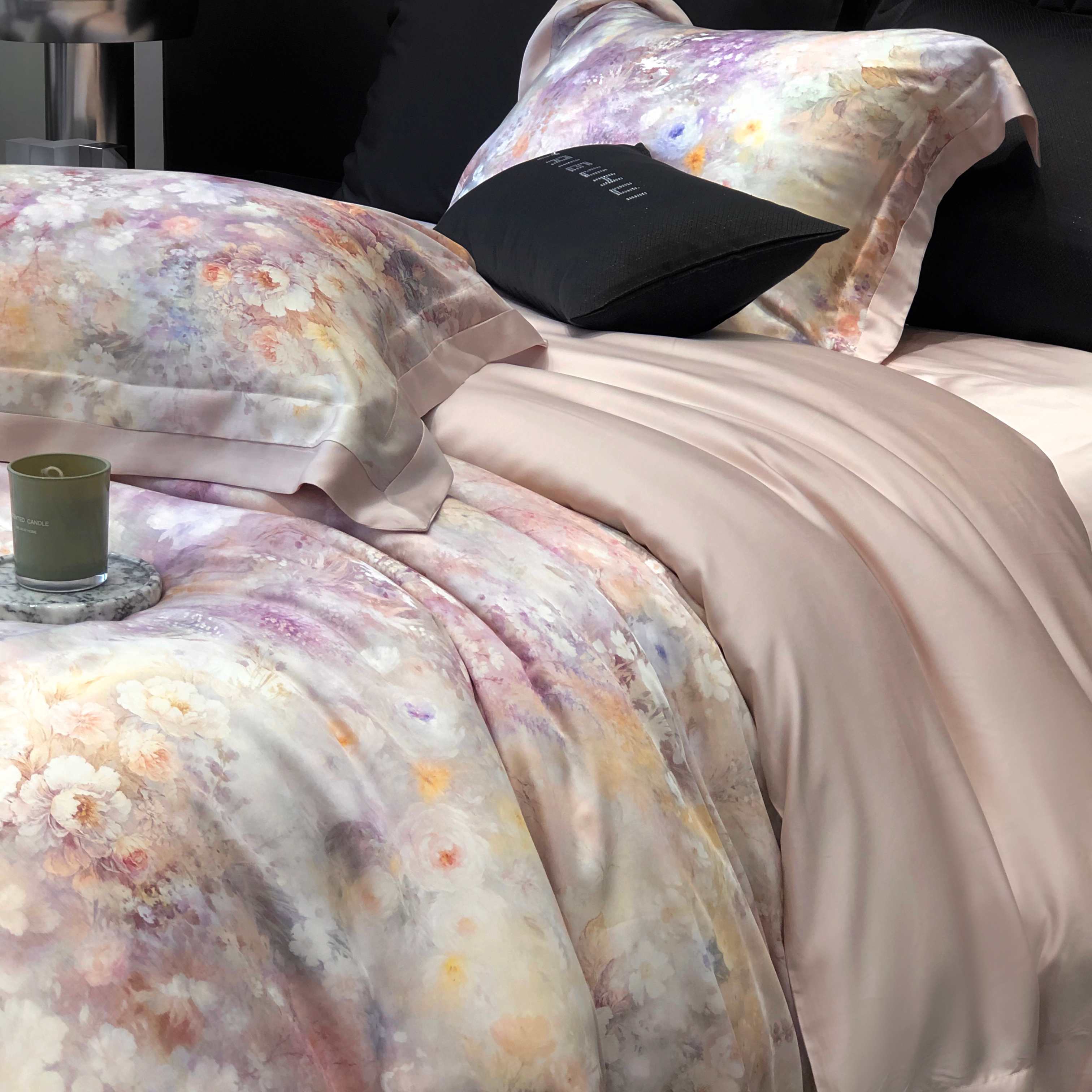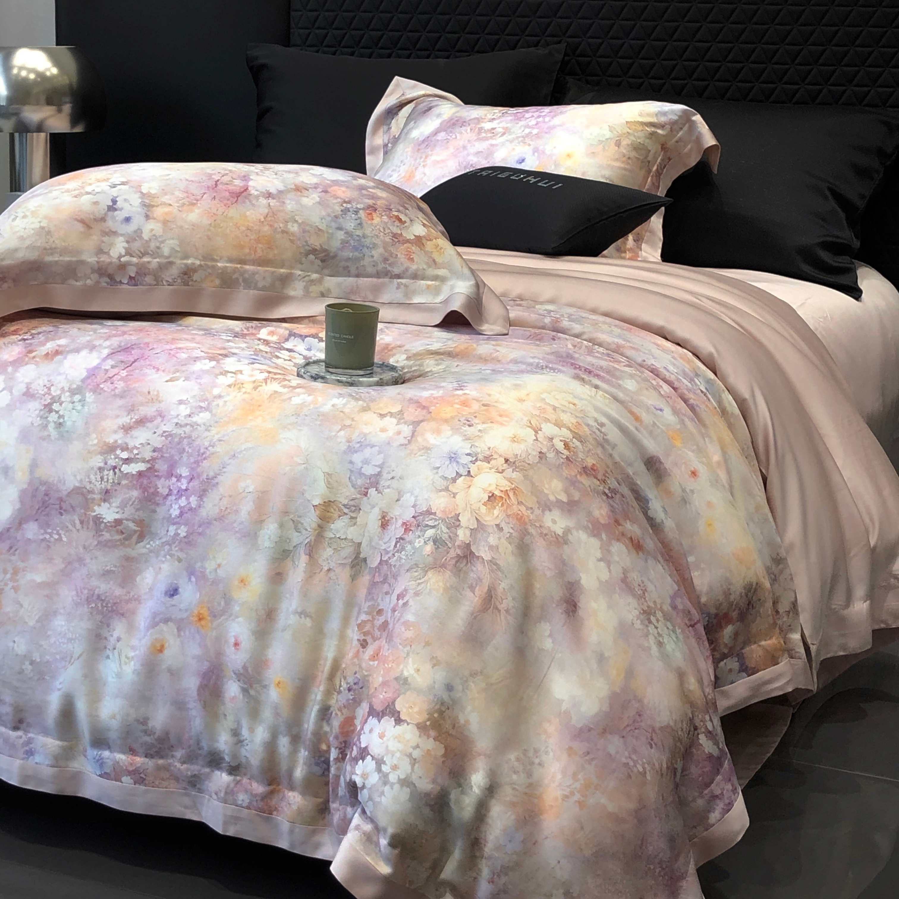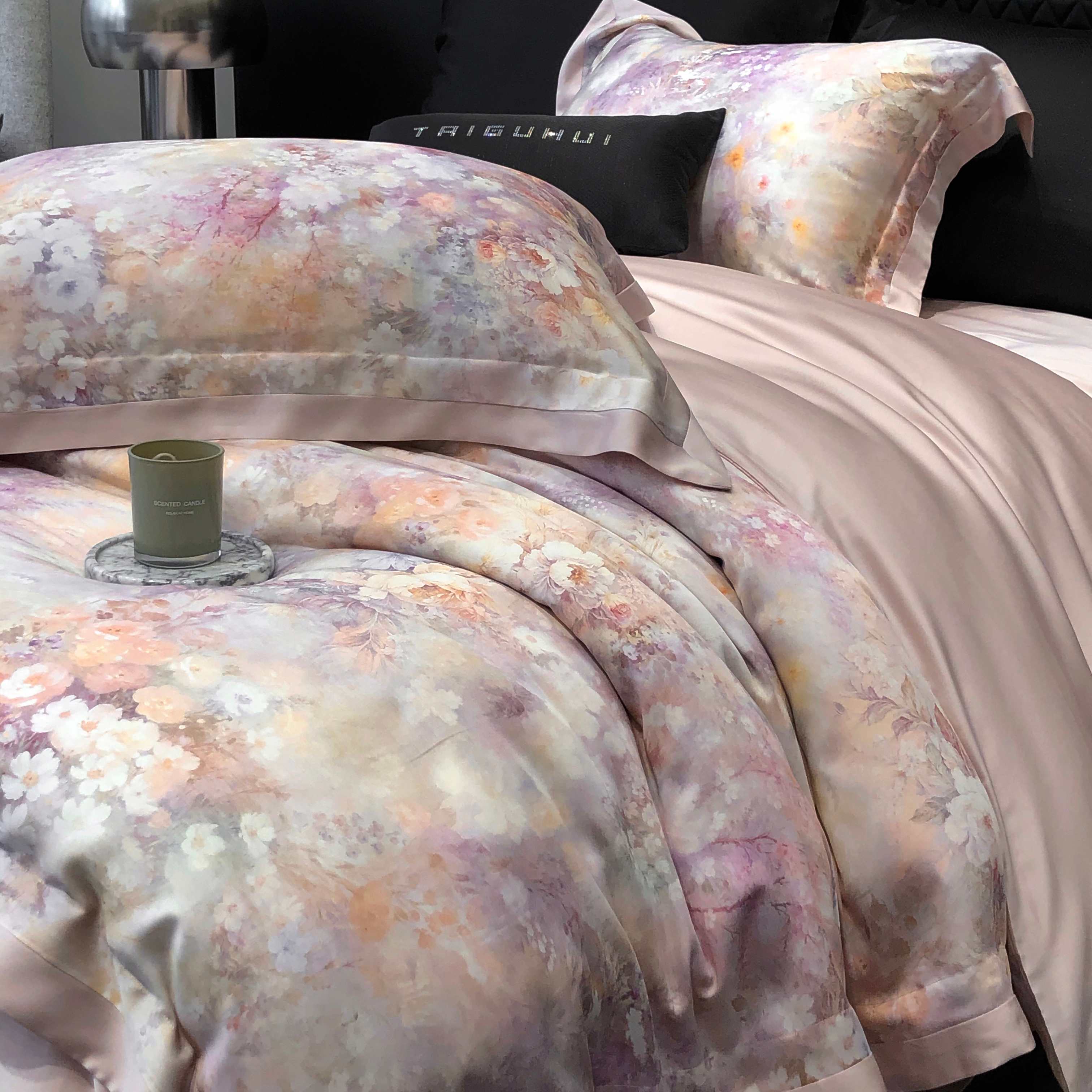 商品名称:太古汇家居 2025新款60兰精天丝宽边被套枕套活性数码印花系列四件套【券后不低于338】 浅夏花开-藕粉
