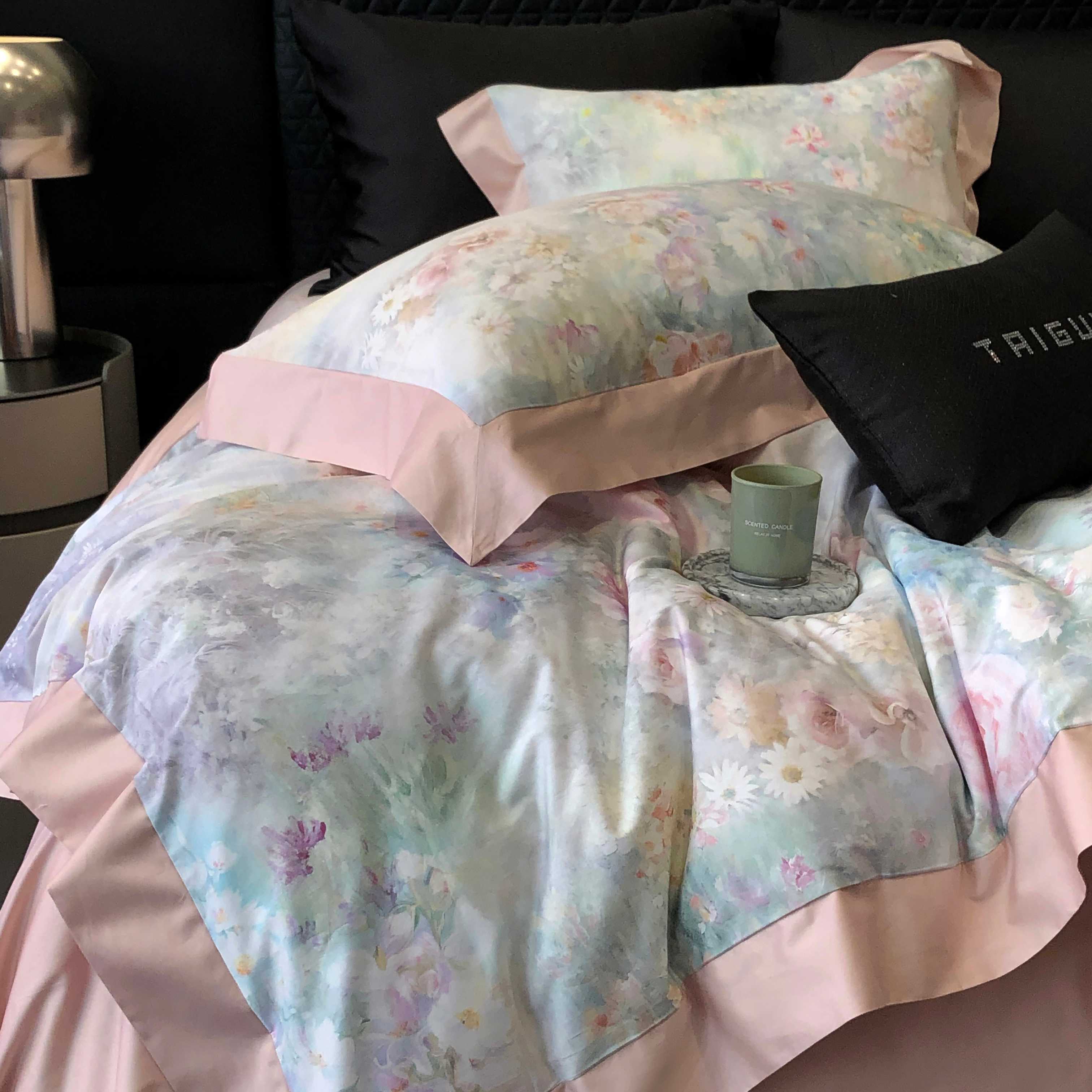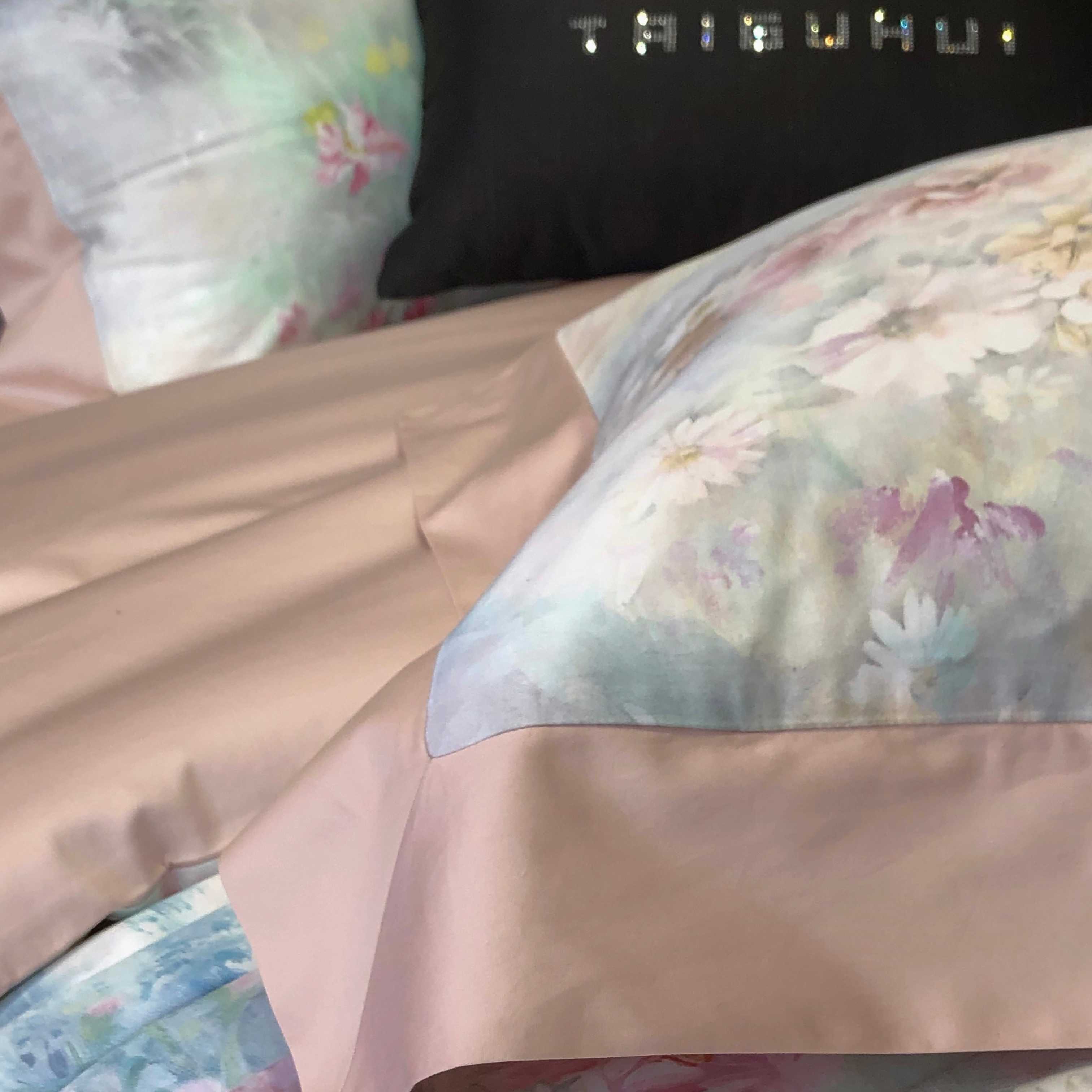 商品名称:2025新款高支高密长绒棉专版数码印花双拼系列四件套-卡梅伦【券后不低于378】 棉沐苒-粉