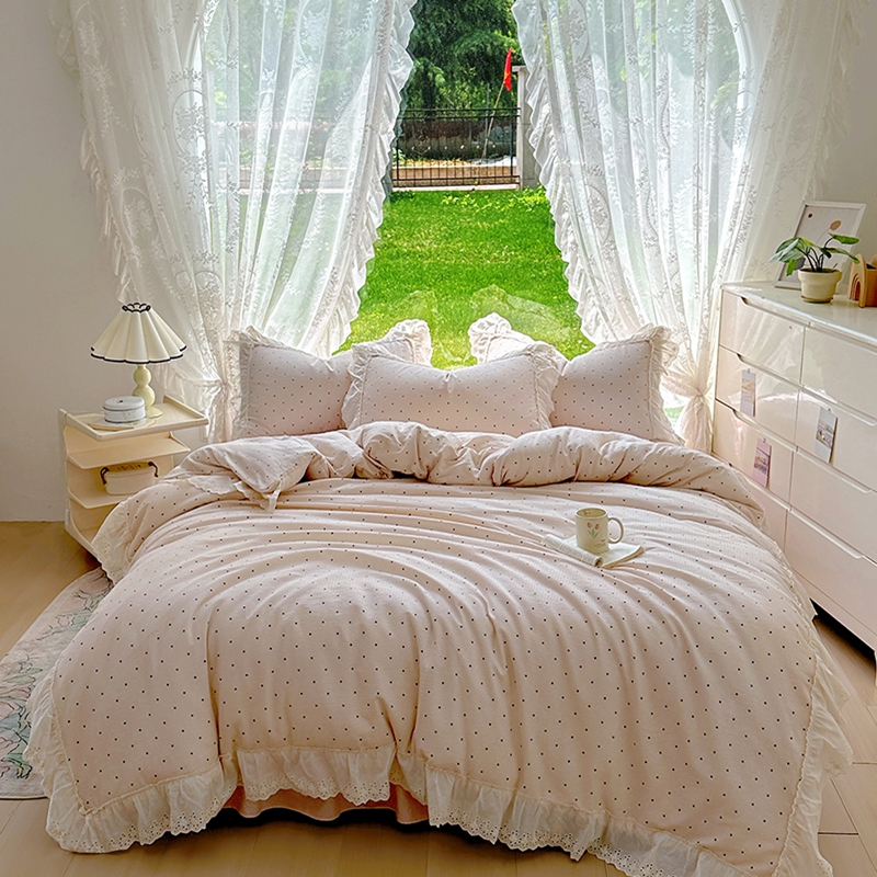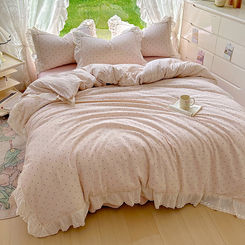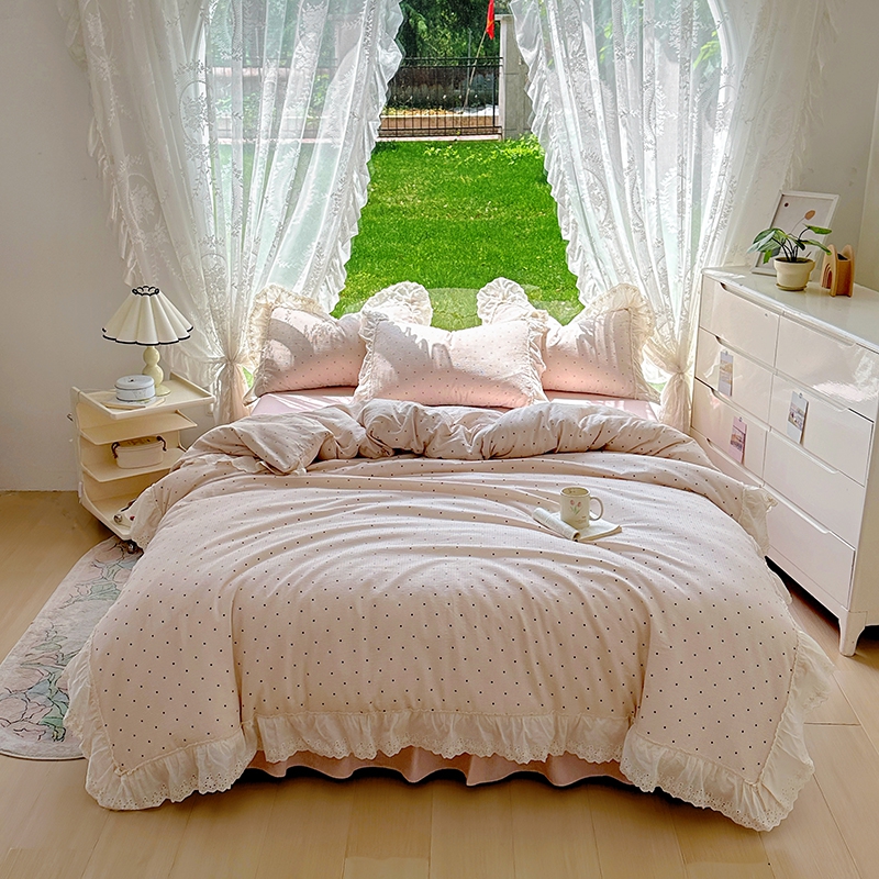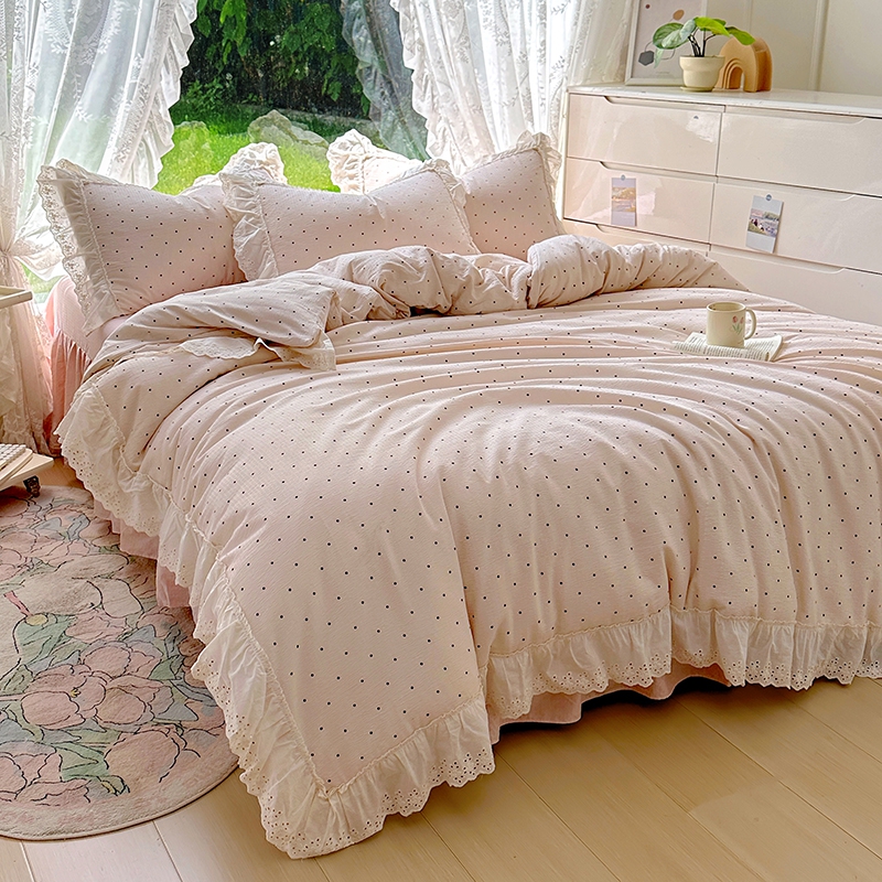 仟网汇 2025新款皱皱纱花边床裙四件套多功能夏被夏凉被空调被四件套四季通用 甜美波点