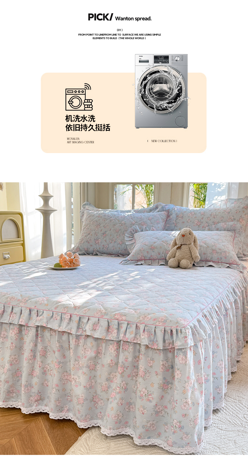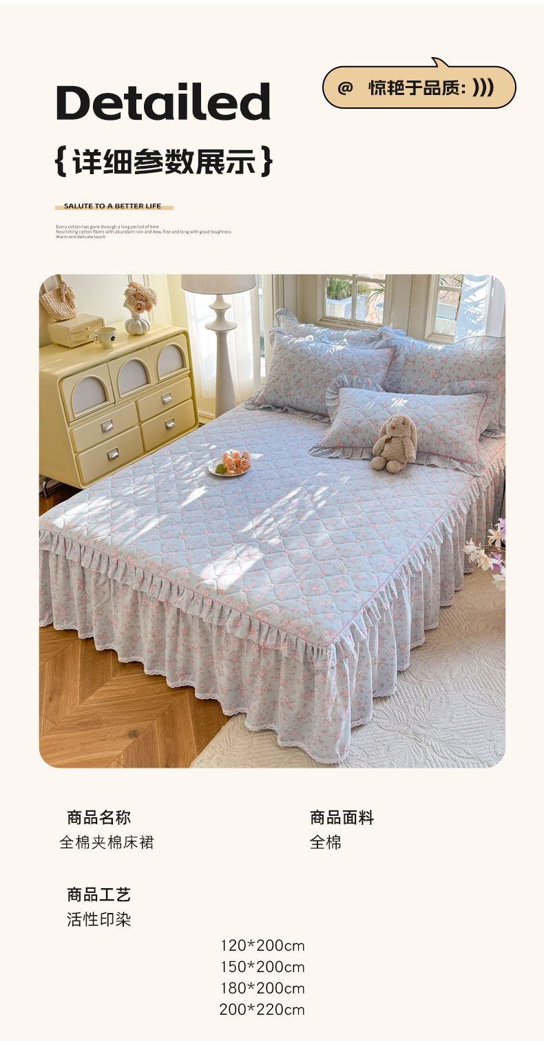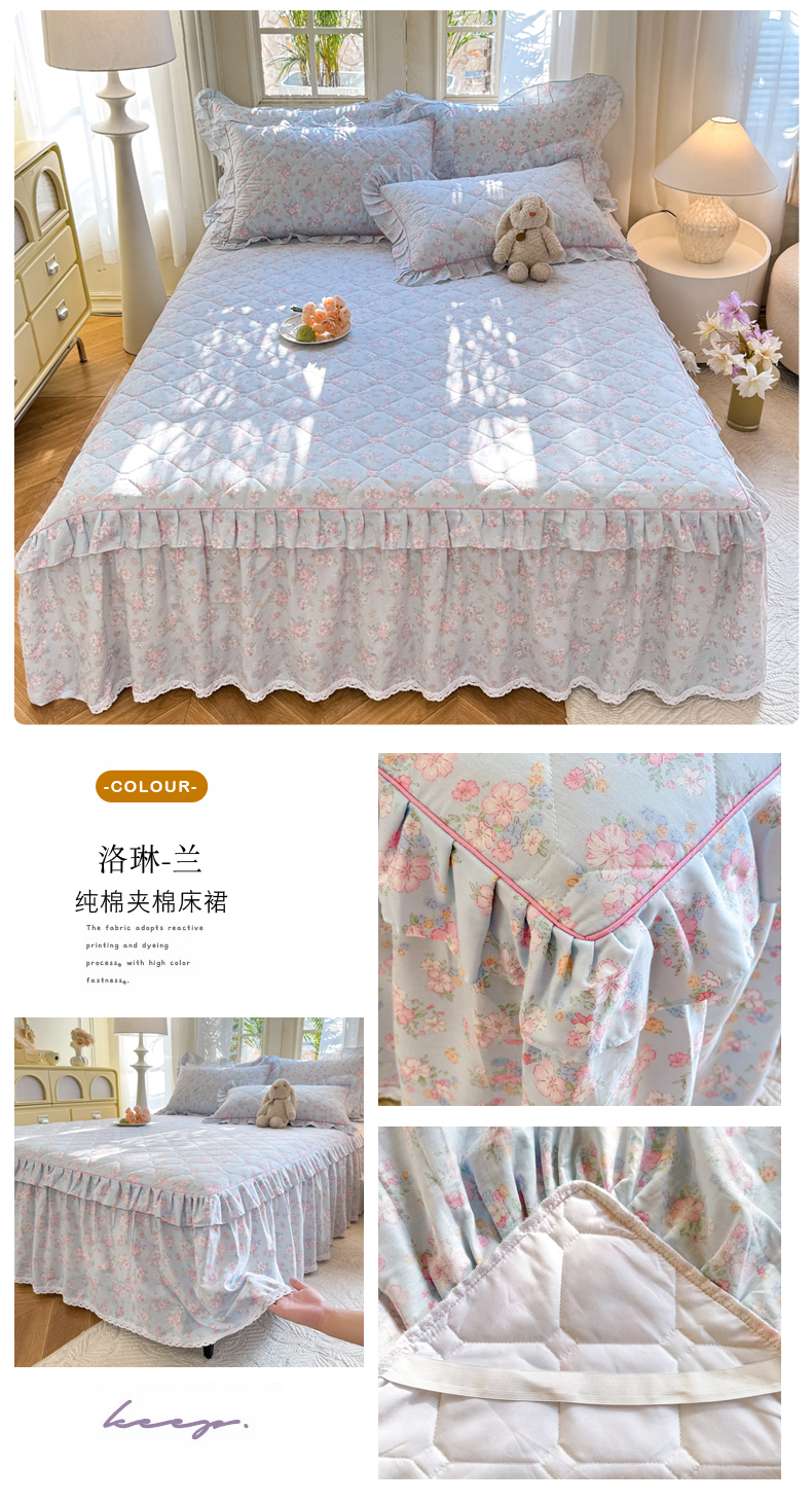 商品名称:美达2025全棉蕾丝小花边夹棉单床裙 洛琳-兰
