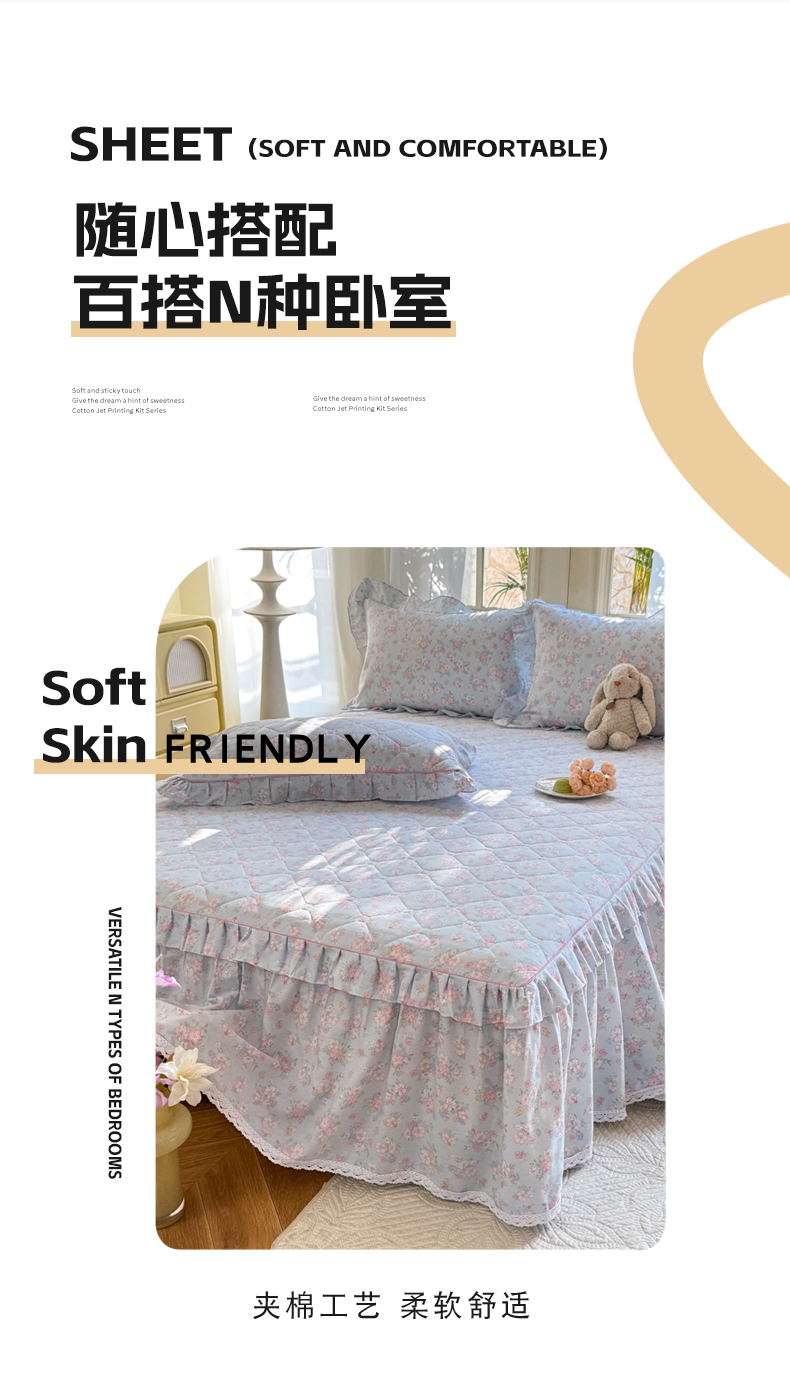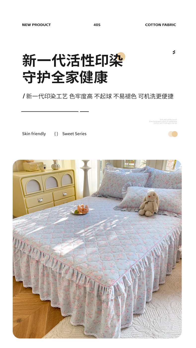 (总)美达家纺 2025新款全棉纯棉AB版蕾丝小花边单层床裙四件套,解语花,南湘,沁雨花叶,悦棠,花香梦境,夏沫浅语-蓝,恋爱小兔,氧气格调,婉宁-粉,镜花水月