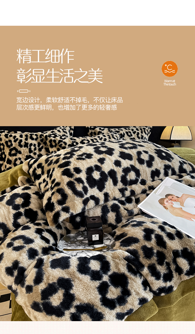 仟网汇 2025新款兔毛绒法式宽边四件套牛奶绒 豹纹卡其