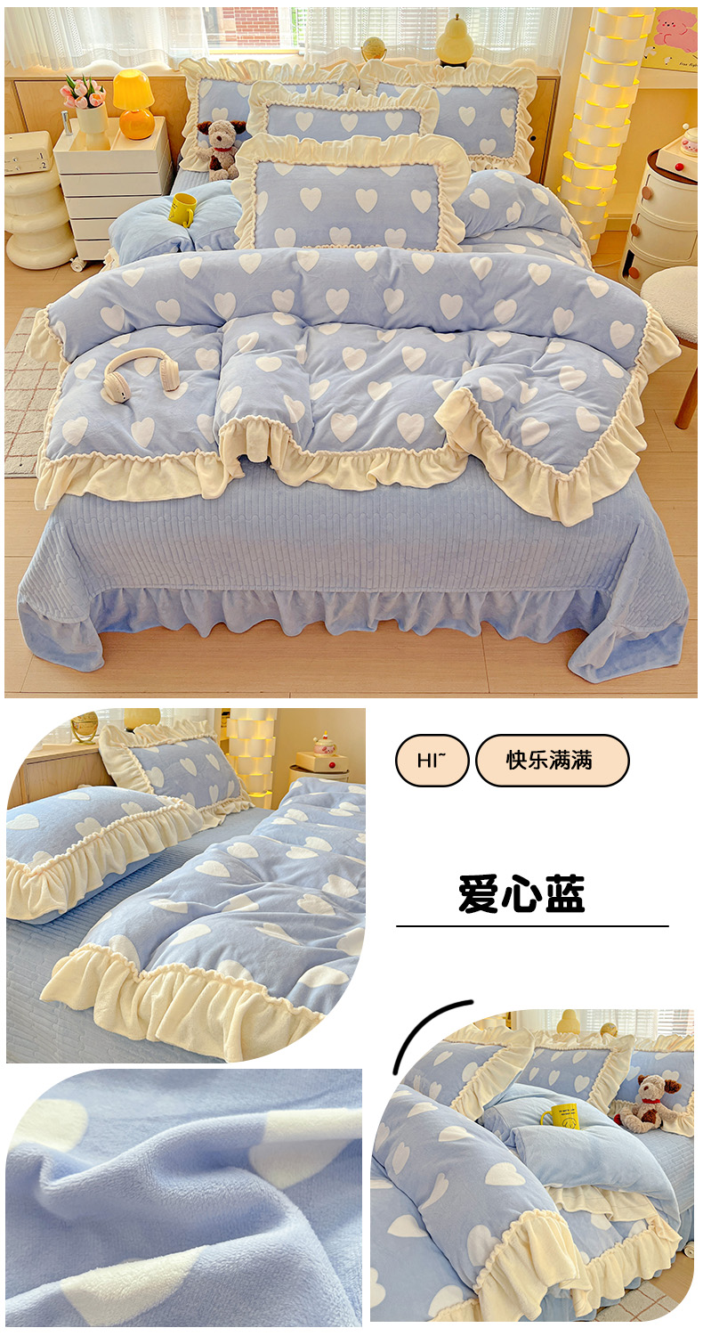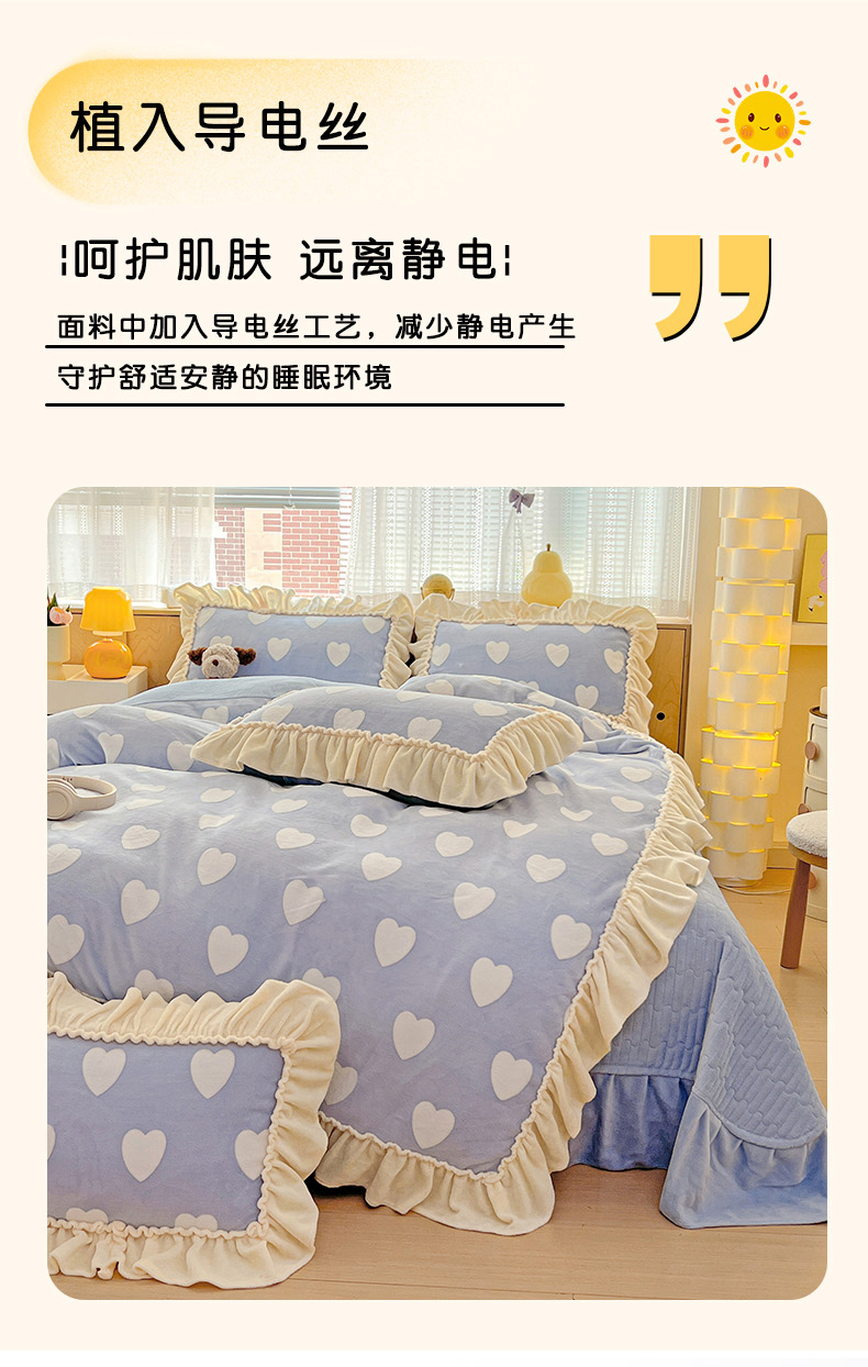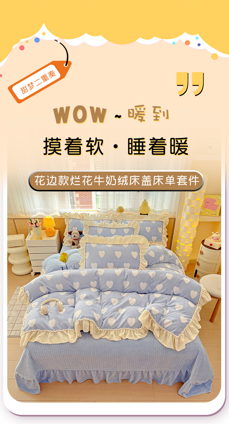 当前位置: 91家纺网 > 商品网购 > 床品套件 > 四件套 > 牛奶绒四件套 > 富米莱(原臻工厂) 2025新款高克重花边款爱心烂花牛奶绒床盖床单四件套-爱心系列 爱心黄