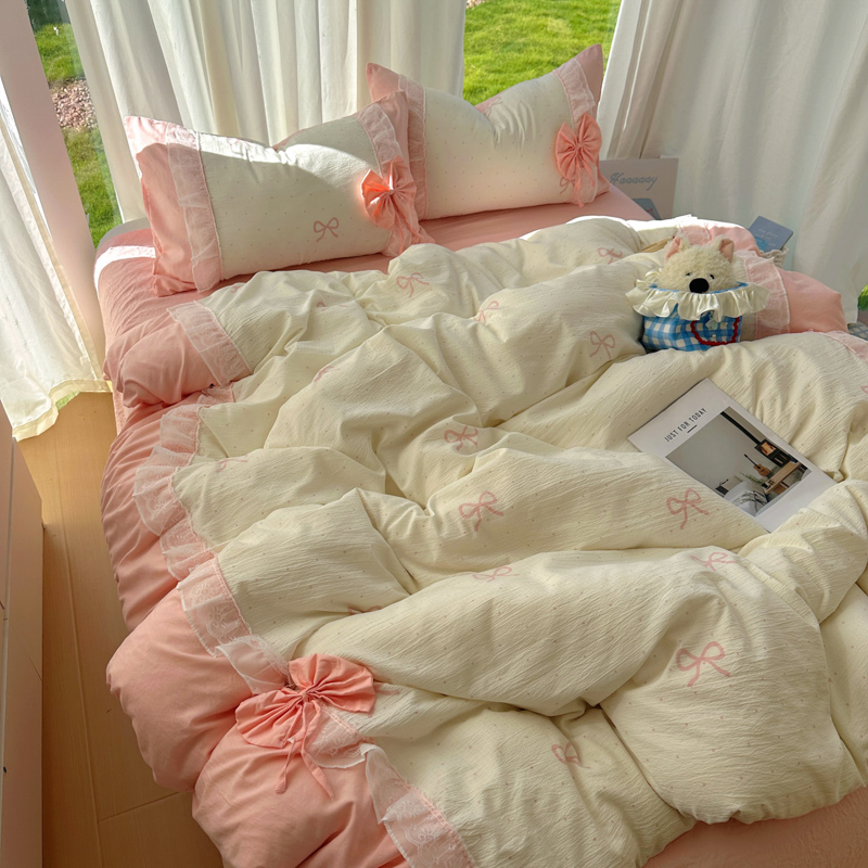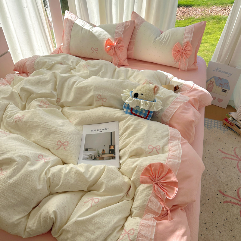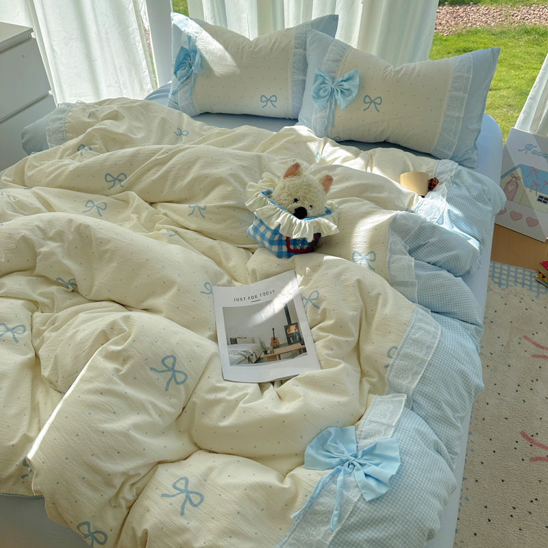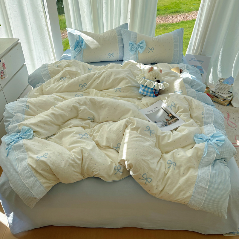 当前位置: 91家纺网 > 商品网购 > 床品套件 > 四件套 > 水洗棉四件套 > 老K (原美阁) 2025新款水洗棉韩版公主风四件套蝴蝶结 蝴蝶结-蓝