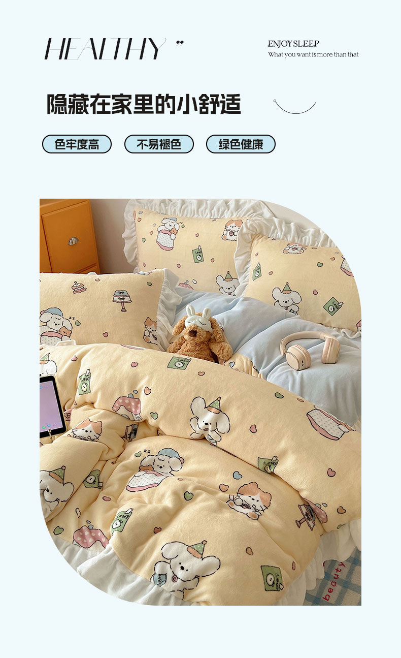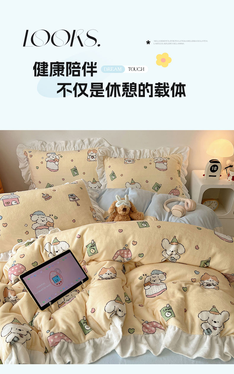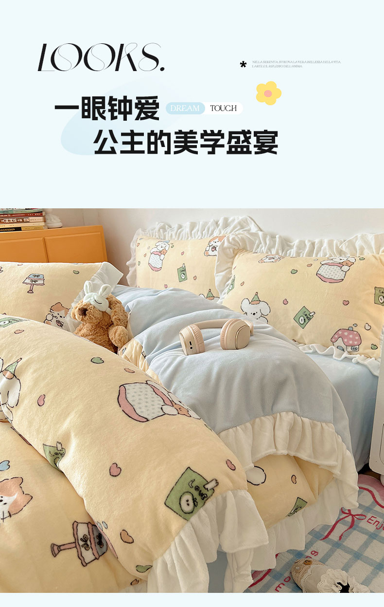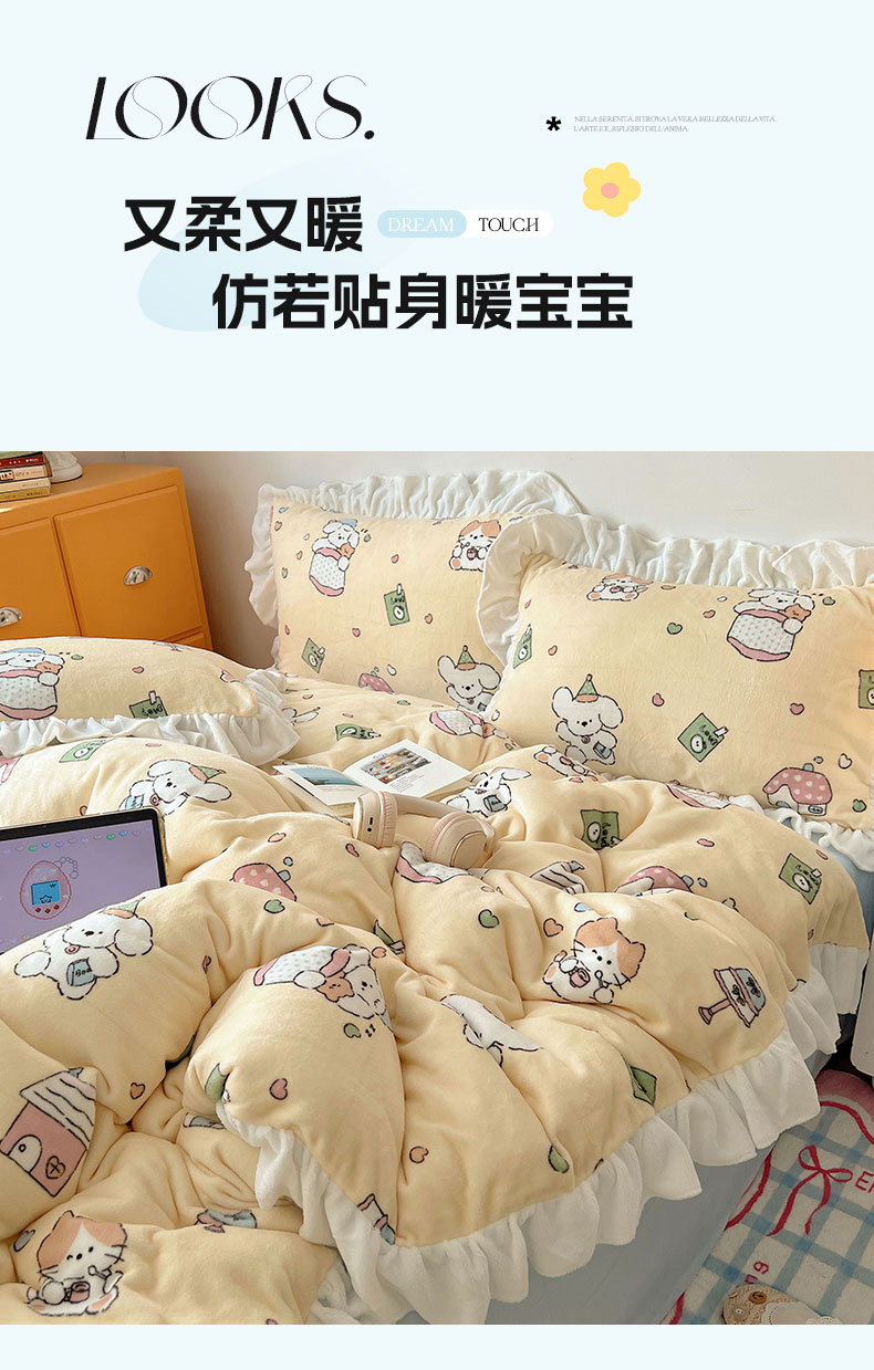 当前位置: 91家纺网 > 商品网购 > 床品套件 > 四件套 > 牛奶绒四件套 > 六巷胡同 2025新款韩式博主风花边款INS卡通牛奶绒四件套(第二系) 花边周末宠物园