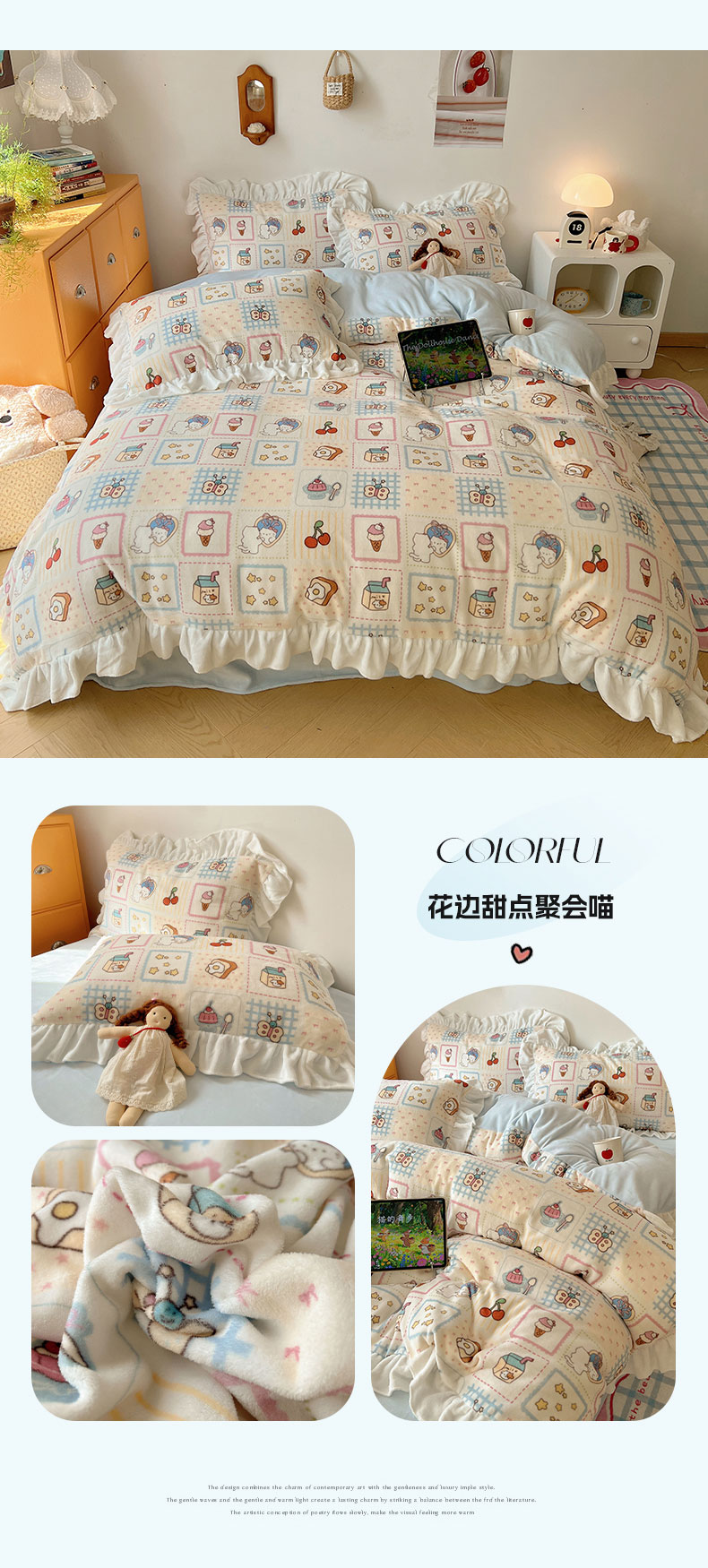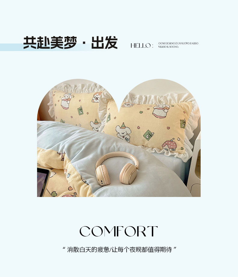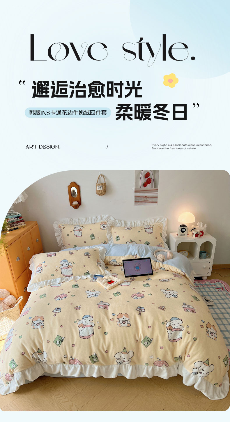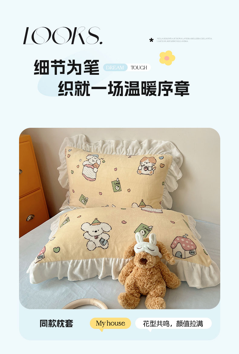 当前位置: 91家纺网 > 商品网购 > 床品套件 > 四件套 > 牛奶绒四件套 > 六巷胡同 2025新款韩式博主风花边款INS卡通牛奶绒四件套(第二系) 花边周末宠物园