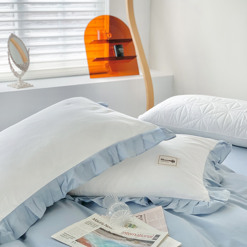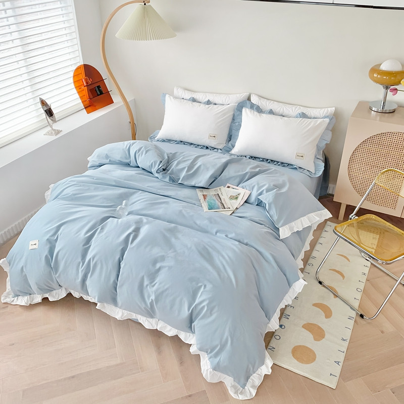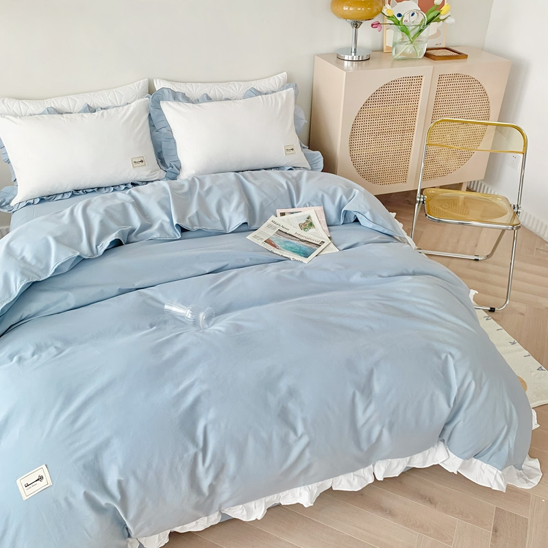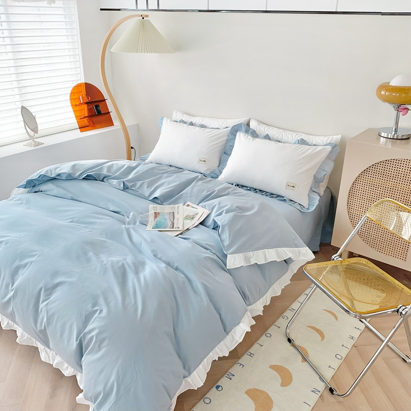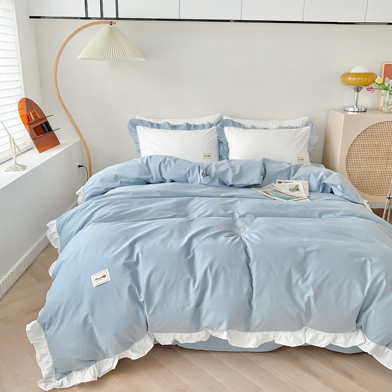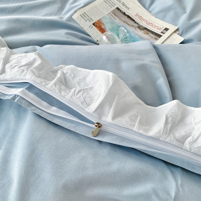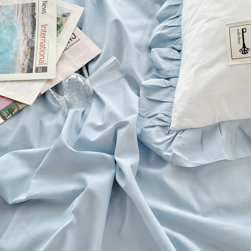 橙艺家居 2022新款全棉色织水洗花边纯色四件套套件 天真蓝