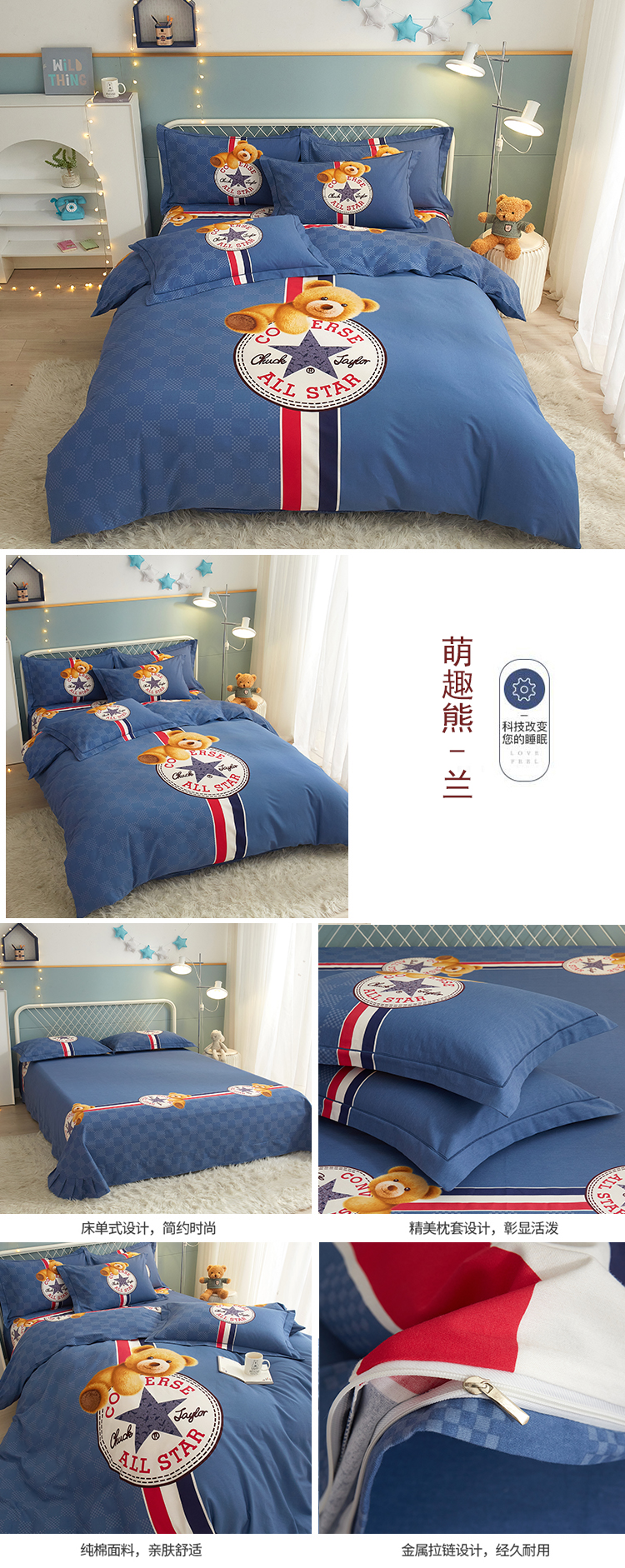 当前位置: 91家纺网 > 商品网购 > 床品套件 > 四件套 > 全棉普通四件套 > 沐白家居 2023全棉大版生态磨毛四件套 萌趣熊-兰