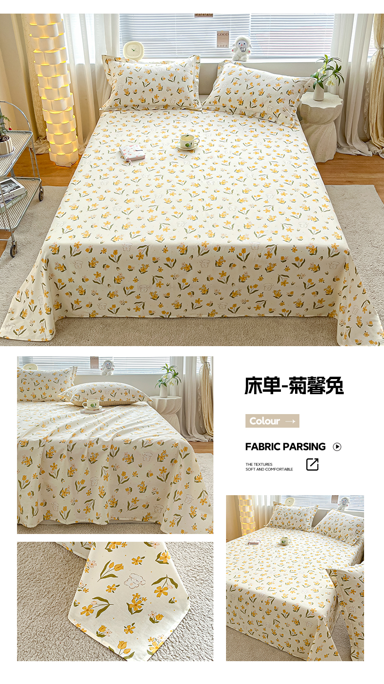 • 91家纺网 家纺一手货源 找家纺 涵宸家纺 2024新款全棉小清新印花单品套件--单床单 床单-菊馨兔