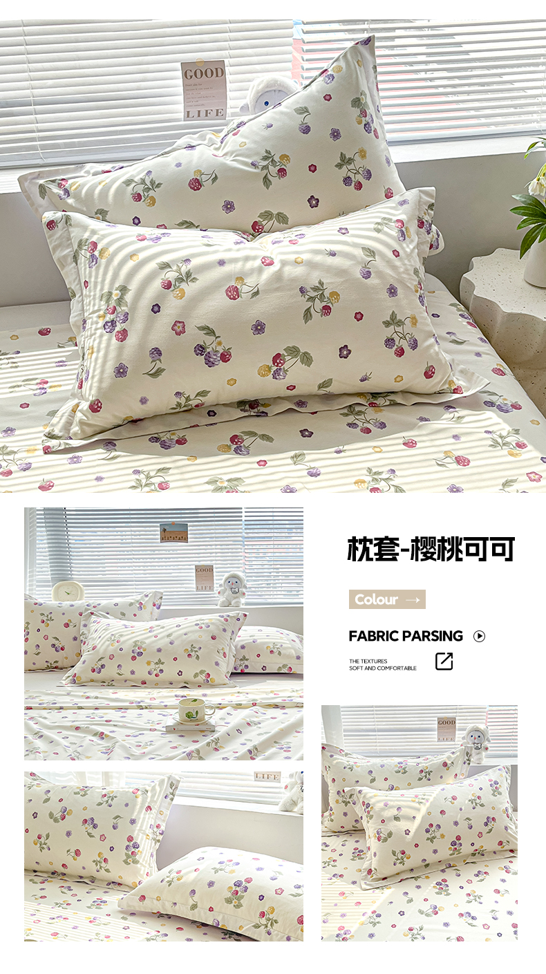 商品名称:涵宸家纺 2024新款全棉小清新印花单品套件--单枕套 枕套-樱桃可可