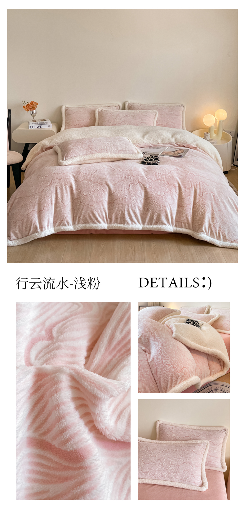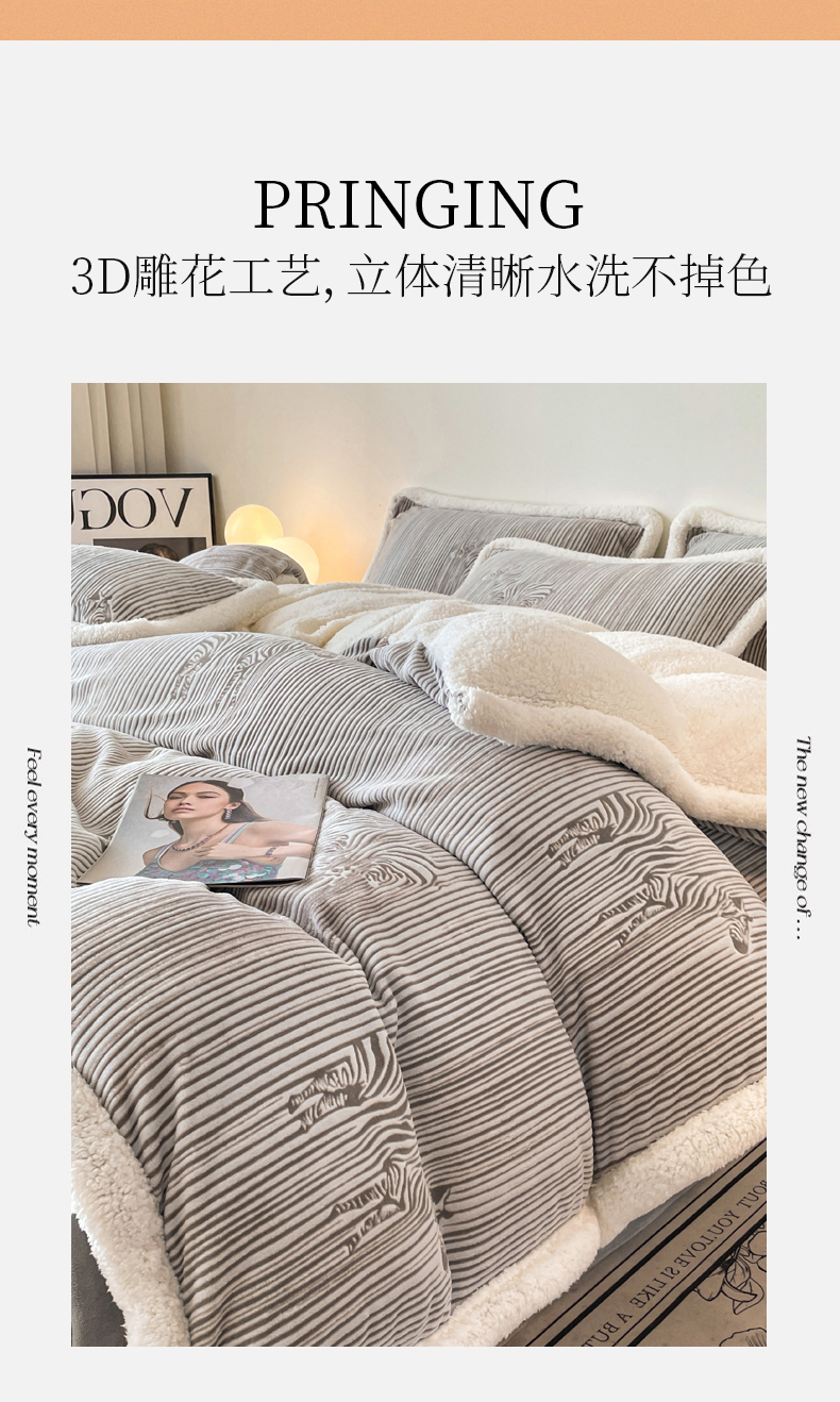 商品名称:慕晨 2024新款A类高克重简奢雕花牛奶绒240G羊羔绒双面加厚被套绒四件套 北欧经典-肉粉