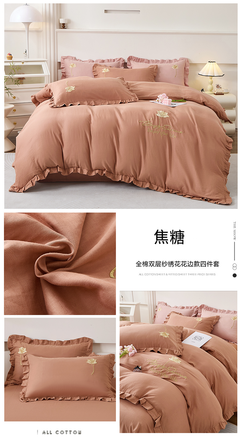 一比一家纺 2025新款全棉双层纱花边刺绣款四件套 焦糖