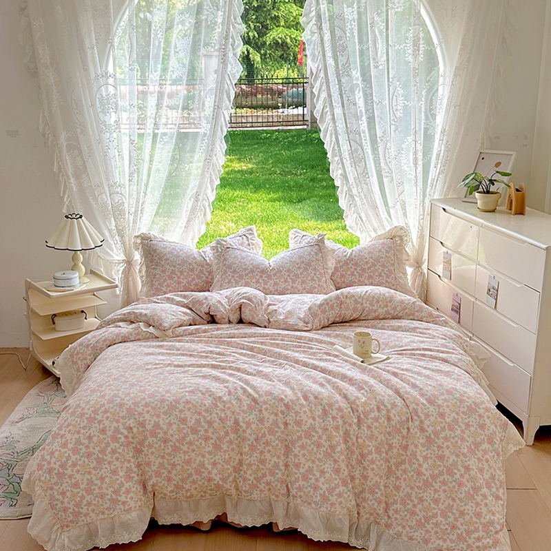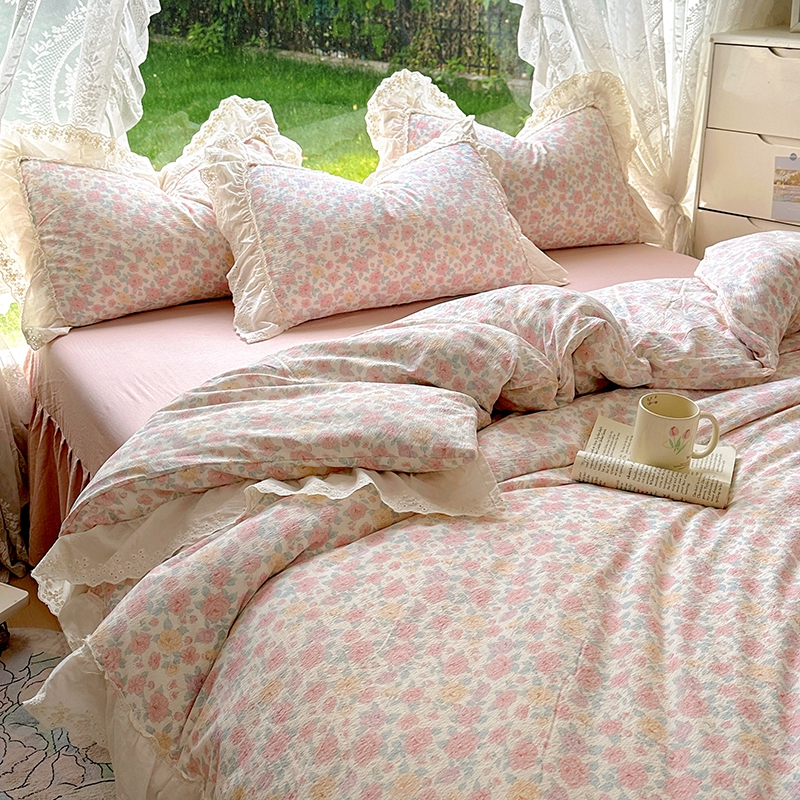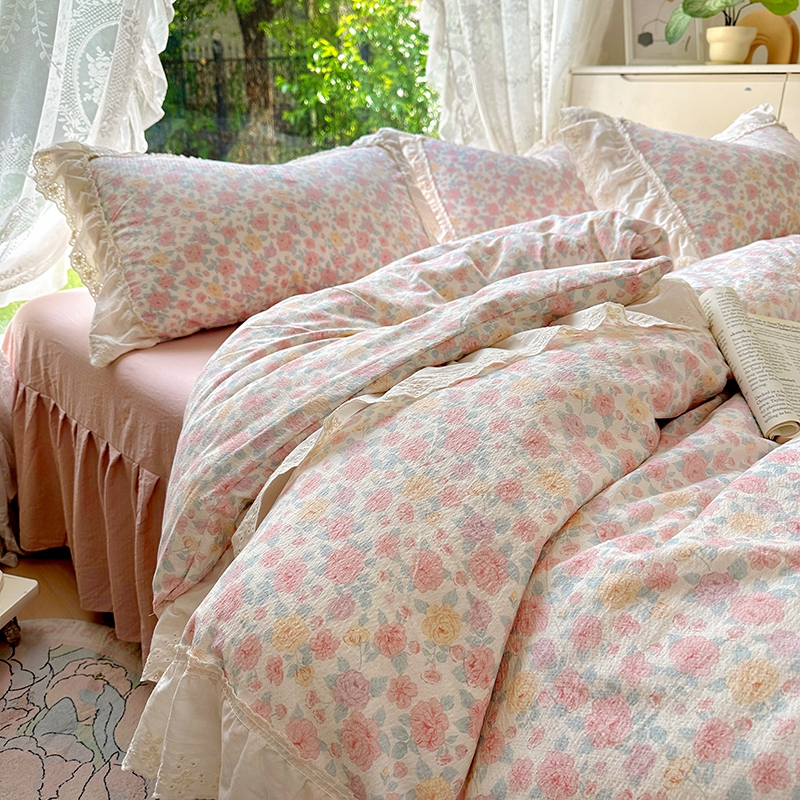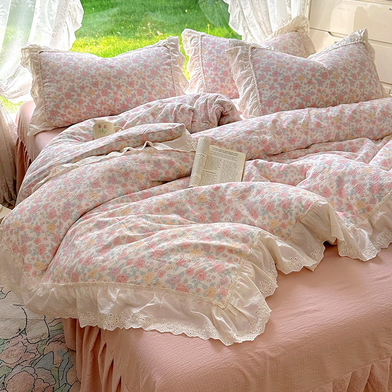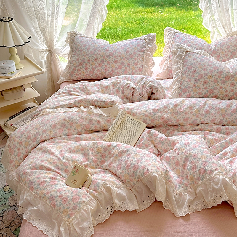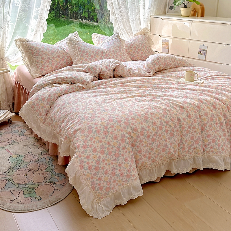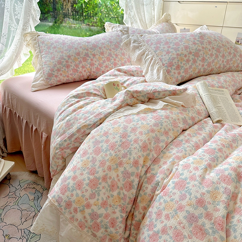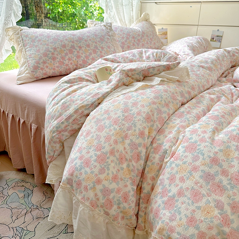 仟网汇 2025新款皱皱纱花边床裙四件套多功能夏被夏凉被空调被四件套四季通用 春意浓