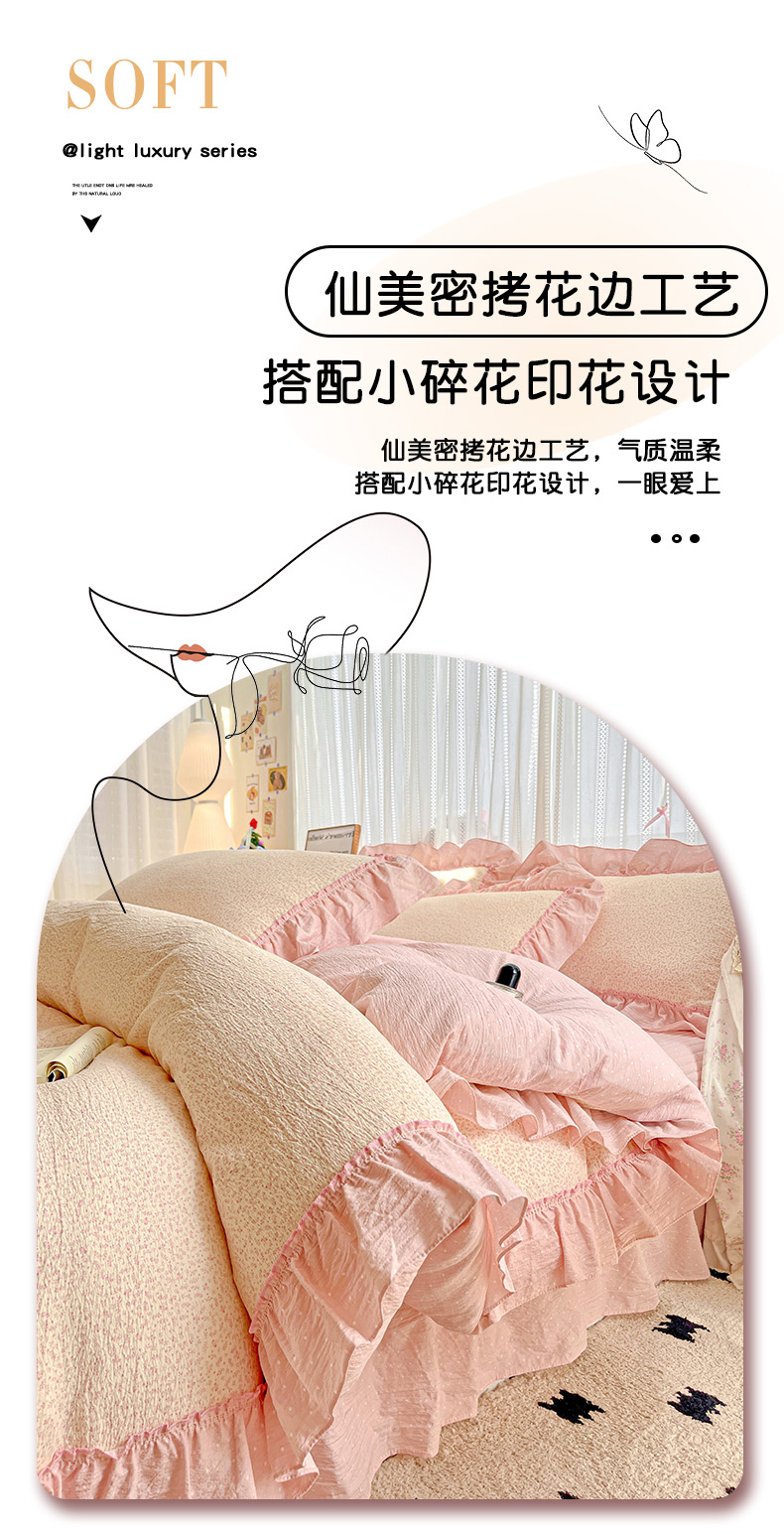 • 91家纺网 家纺一手货源 找家纺 (总)富米莱(原臻工厂) 2026春夏新款仿棉A类韩系大花边床盖床裙四件套,小杏芙,波点汽球,悠悠花香,烟火气星辰,小花蓝,小花粉,晚樱落海,山樱漫岛,玫瑰庄园,花影,耳机猫猫,动物世界,七彩点点,艾利花园