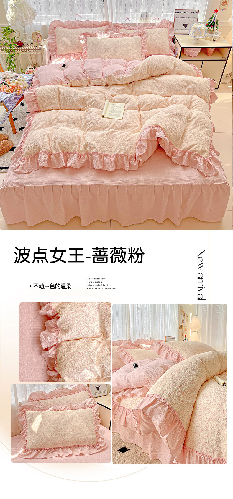 2025秋冬加厚款云感亲肤棉邹邹纱床盖床裙四件套-仙美密拷花边 波点女王-蔷薇粉