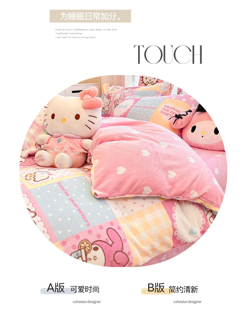 当前位置: 91家纺网 > 商品网购 > 床品套件 > 四件套 > 牛奶绒四件套 > 暮思家居 2025新款三丽鸥正版授权高克重200克加厚保暖卡通牛奶绒四件套 牛奶绒-KT美乐蒂