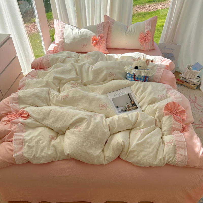 当前位置: 91家纺网 > 商品网购 > 床品套件 > 四件套 > 水洗棉四件套 > 老K (原美阁) 2025新款水洗棉韩版公主风四件套蝴蝶结 蝴蝶结-粉
