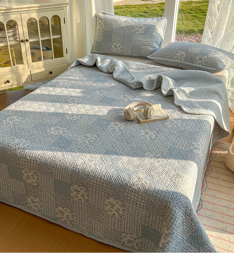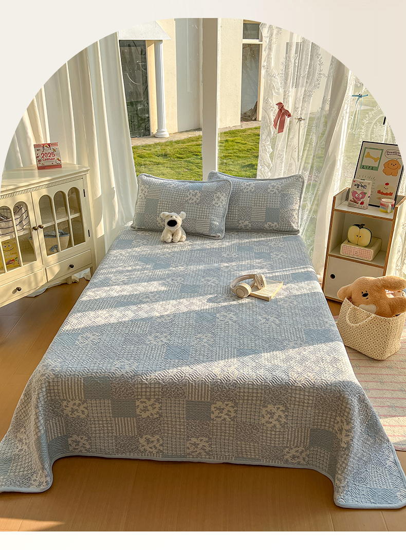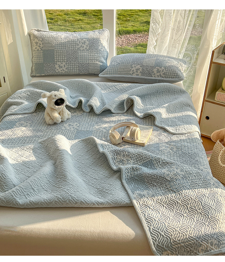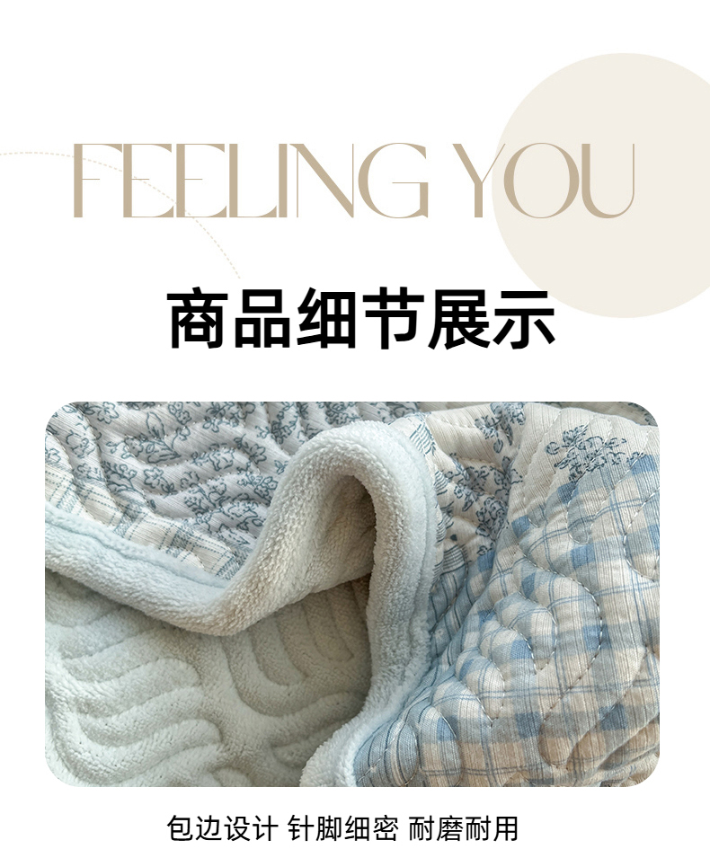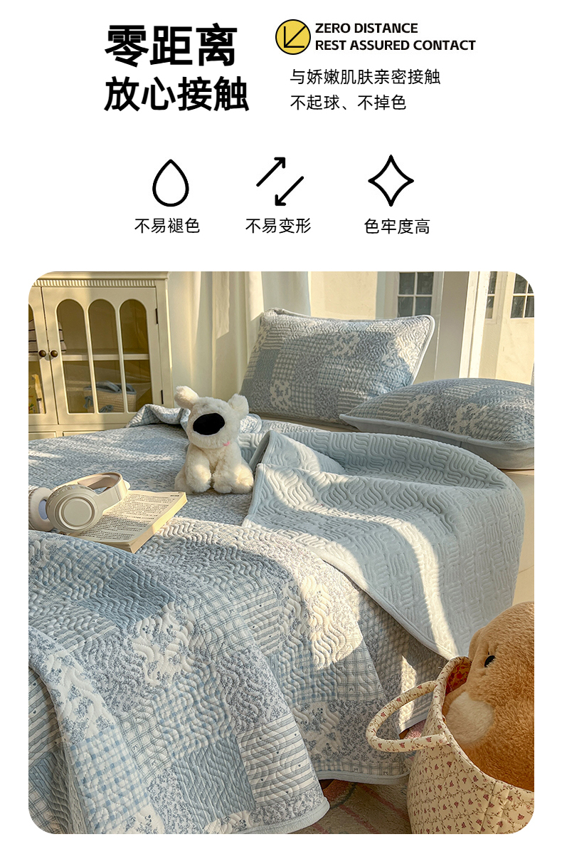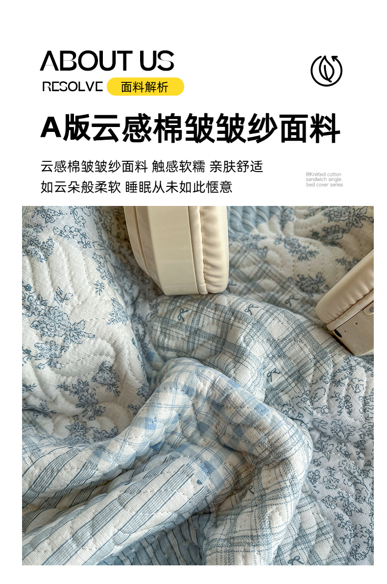 • 91家纺网 家纺一手货源 找家纺 春光里 2025新款A版云感棉皱皱纱B版牛奶绒夹棉床盖三件套 赫拉-蓝