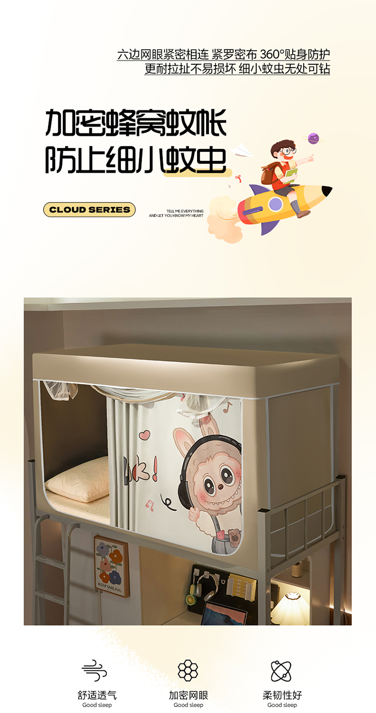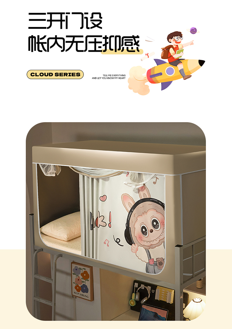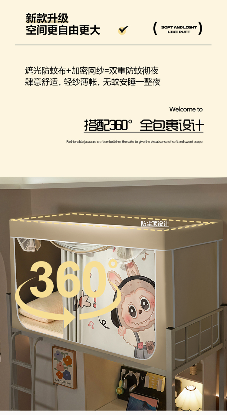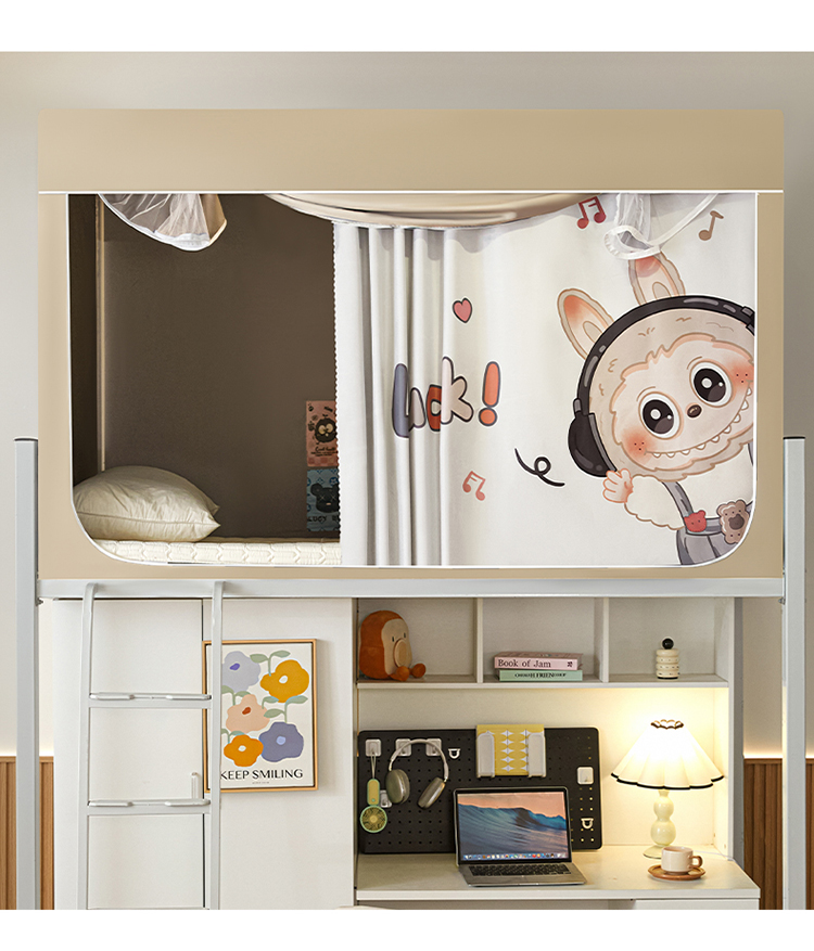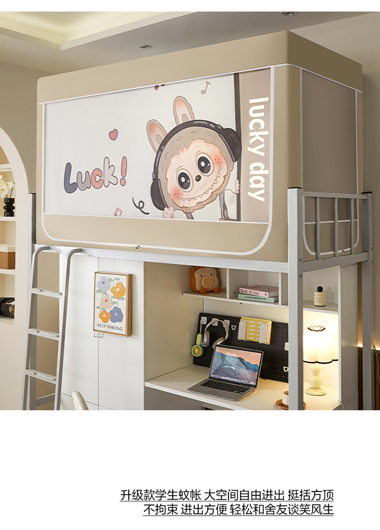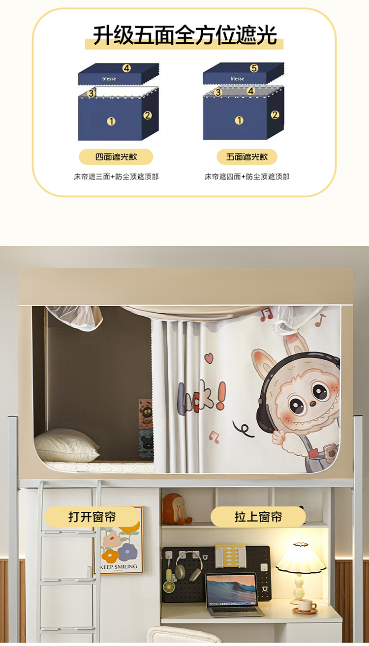 商品名称:初心家纺 2026新款99%五面遮光加厚涂层遮光大版数码印花带靠墙帘卡通学生蚊帐 奶萌labubu