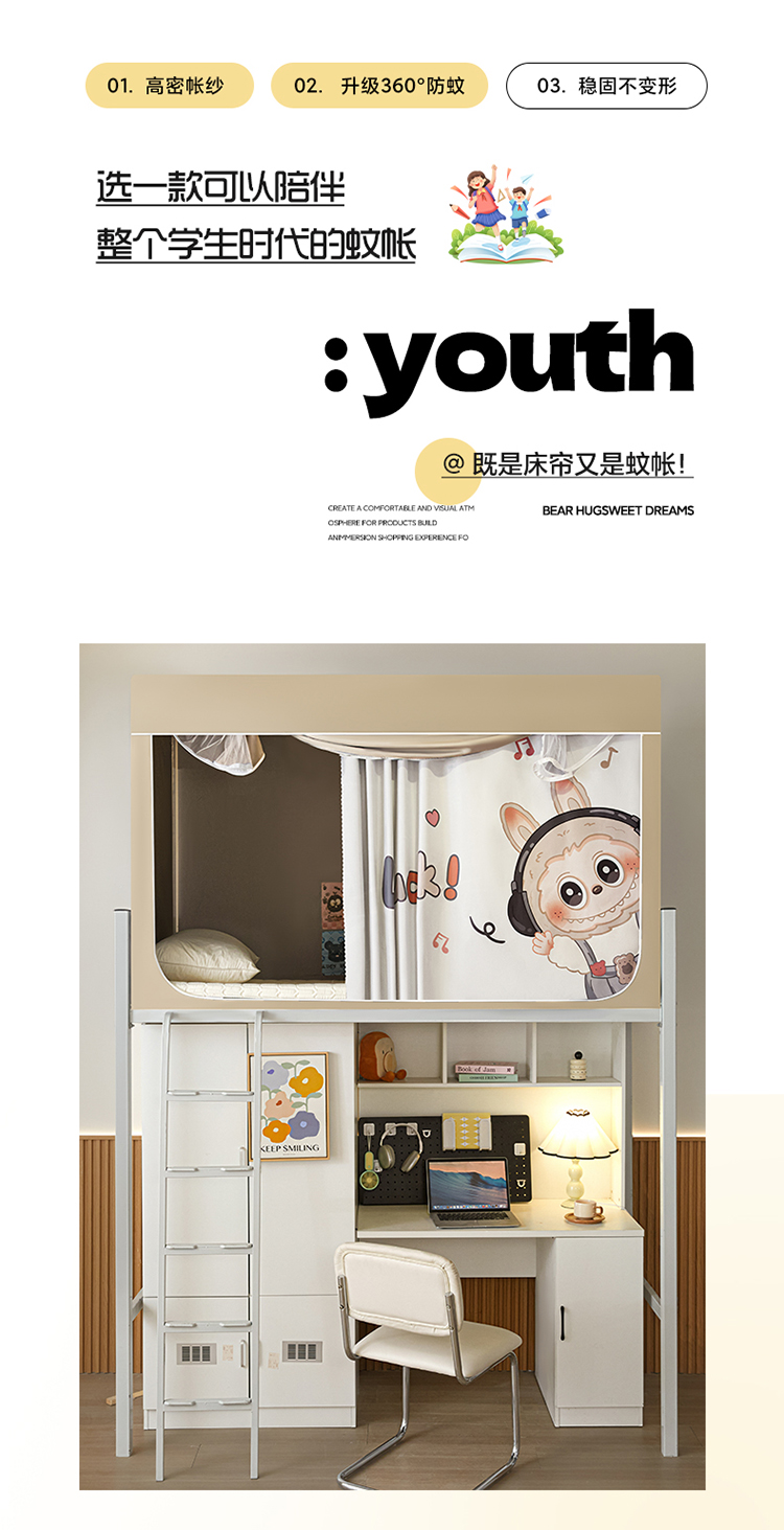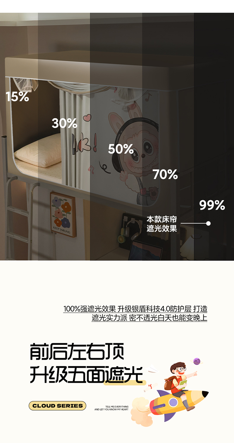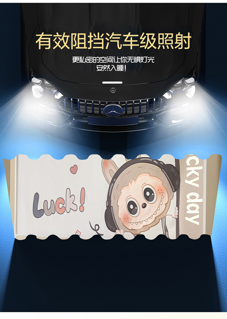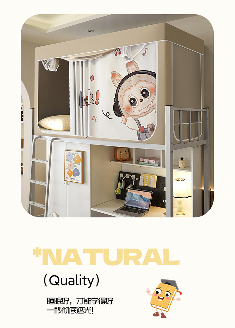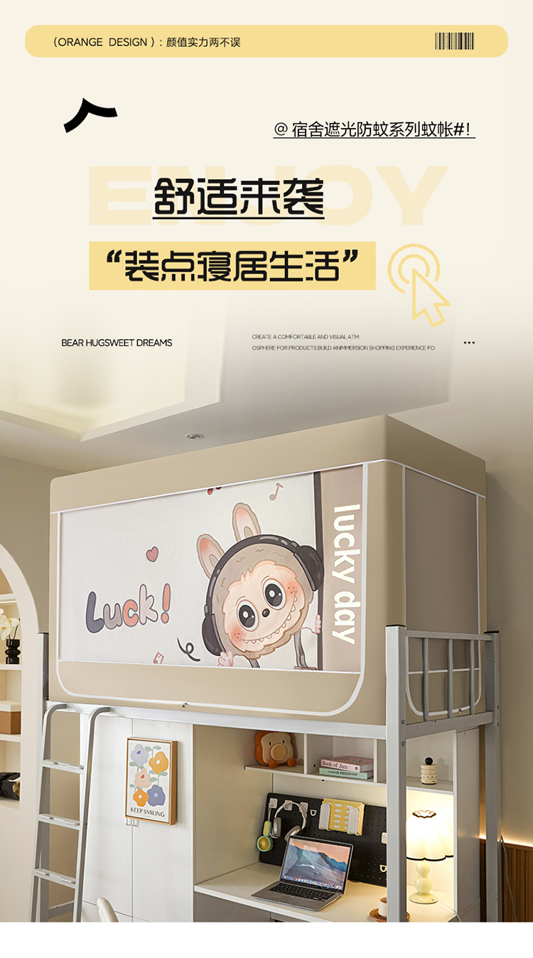 商品名称:初心家纺 2026新款99%五面遮光加厚涂层遮光大版数码印花带靠墙帘卡通学生蚊帐 奶萌labubu